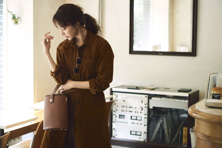 This monochrome coordinate sees a brown shirt dress layered over a long skirt. The disparate fabrics of corduroy and rayon together form a stylish combination. This year, consider letting the skirt peek out from under the dress and draw attention downward. Raise the classy feel through trad brown leather accessories.