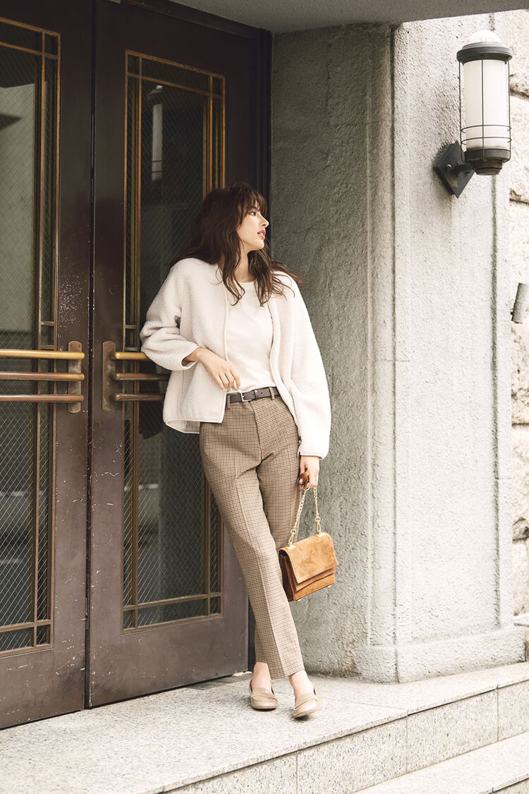 A pure white pile-lined blouson brings an adorable touch into a mix that includes plaid pleated pants. The latte-like color combination of rich, smooth beige and white is very in touch with the times! Because the top’s and bottoms’ tones are light, tighten the look with chic accessories, like a brown leather belt and camel faux-suede bag.