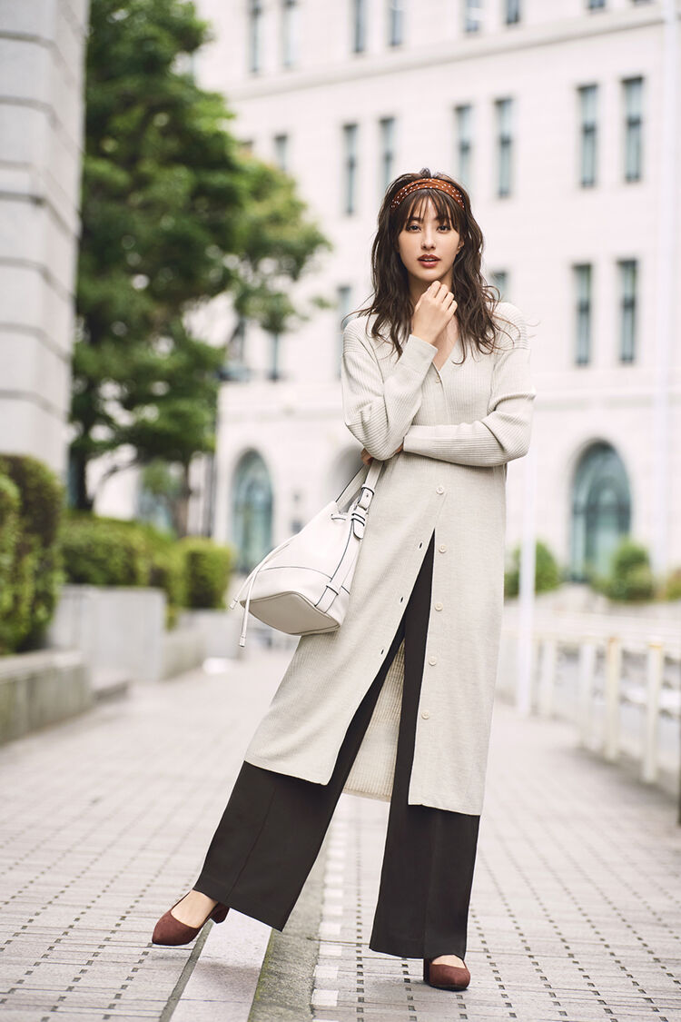 Button up the front of this cardigan and wear it in the style of a long dress, while layering it over wide-leg pants. Use light beige and deep brown to create a light-to-dark gradation. A combination that sees a long item paired to a long item tends to appear heavy, but the gradation should foster a laid-back feel. Choose brown for the pumps as well for a smart, leggier appearance.