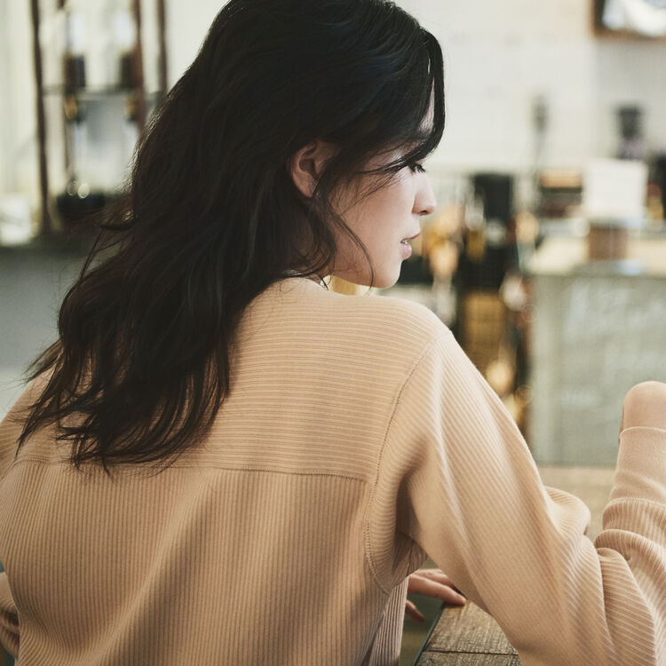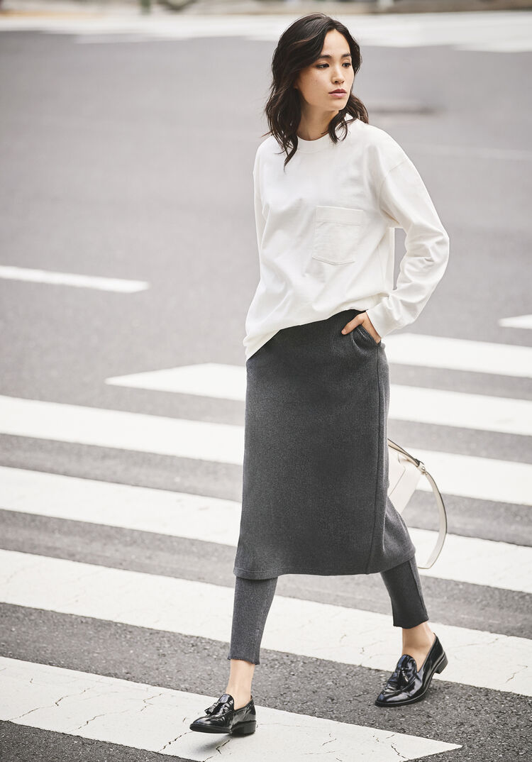 This tee is made of an ideally thick fabric with medium-width ribs, so it has a clean-look, casual feel that’s perfect for grownups. It naturally complements a feminine mix of items, say one that includes a pleated skirt, but it looks great when paired to jeans or cargo pants without ever appearing too rough. Neither too snug nor too loose, its exquisite silhouette dispels the negative image of ribs producing a heavier look. The back features a switched design in which horizontal ribs replace the vertical ribs, so the item appears trim at back as well.