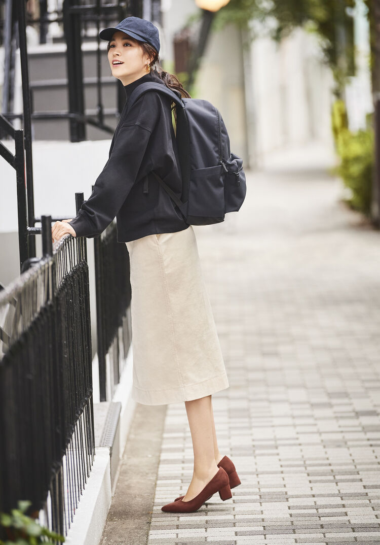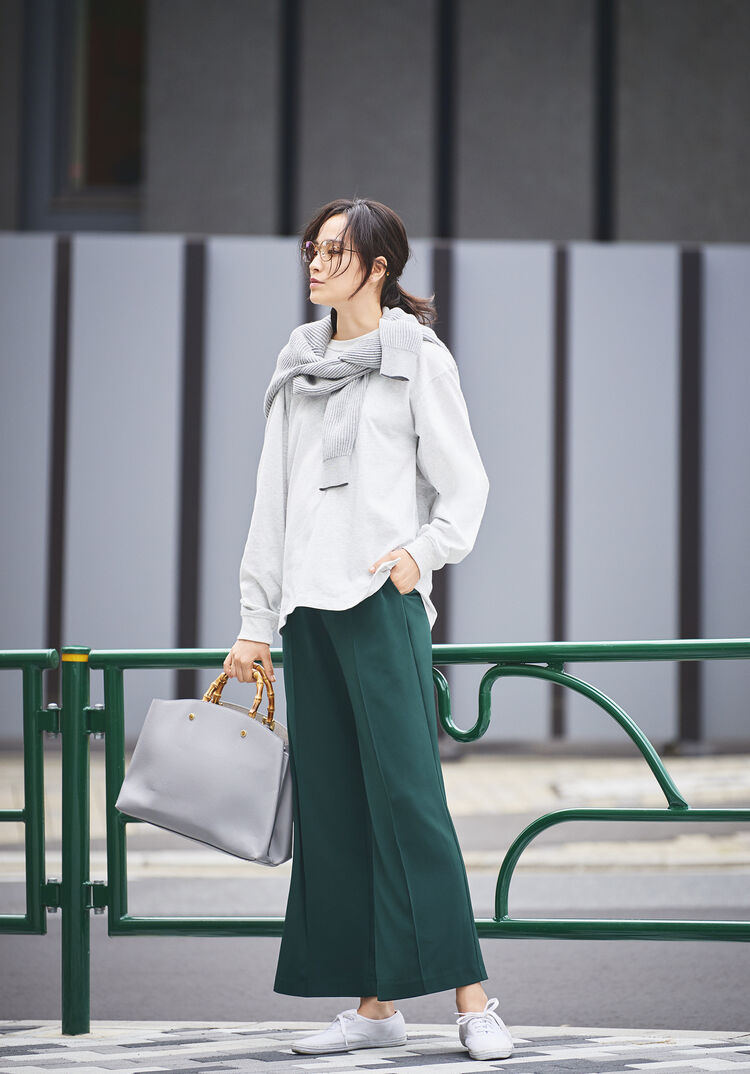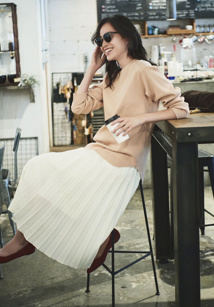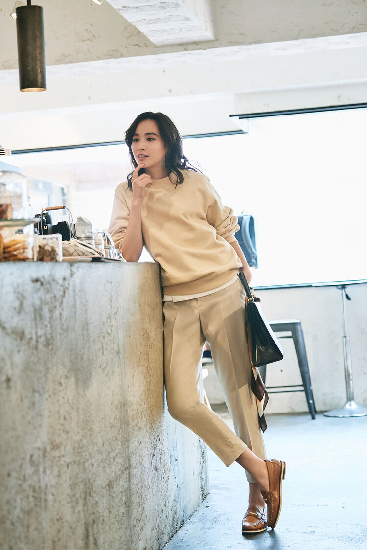 Made of a sweat fabric, this popular top single-handedly confers great looks on top of comfort. The neck line that’s produced by the narrow opening brings out the loose silhouette of the item’s drop shoulder design. Create a gradated beige coordinate that’s perfect for this year by building around this tee whose deep, rich color hints at fall. Then let a white tee peek out from underneath to add some contrast.