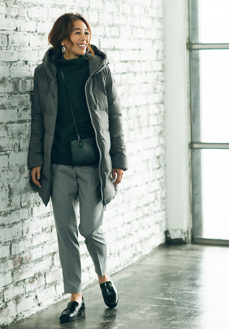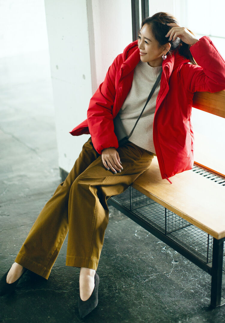 Vividly colored down items have a decidedly youthful feel to them, so use them to your advantage. Even winter looks, which tend to be dark, gain a stunning feel when you coordinate the rest of the arrangement in chic colors. Stick to a regular, basic look for the sweater and pants underneath, and try this approach of brightening the coordinate with the outerwear layer. A warm look that’s unlike the usual is sure to result!