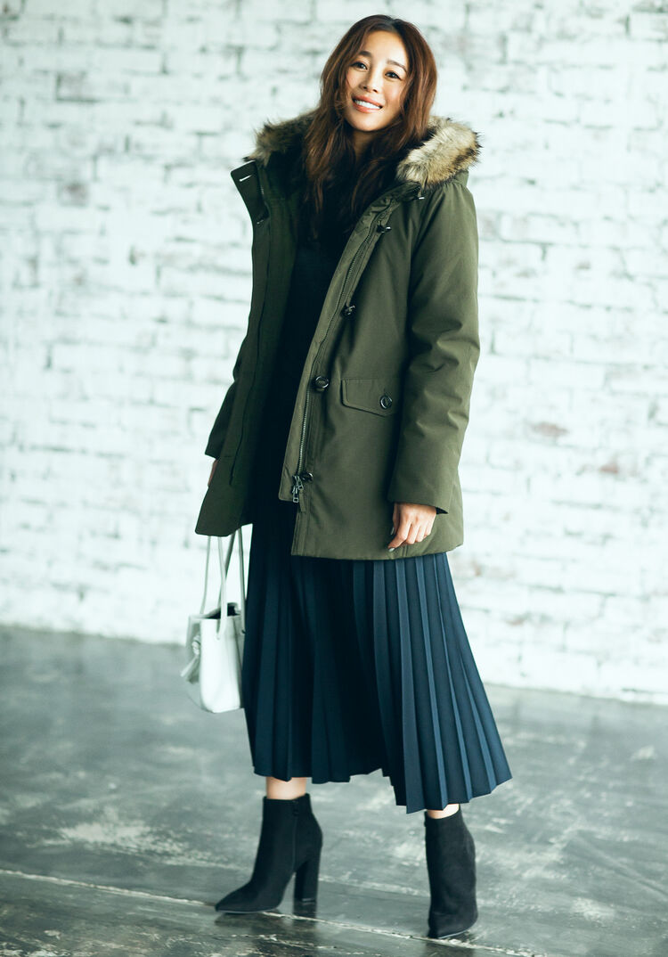 Deliberately coordinate this down coat with its faux fur and masculine design to dressy items. The perfect balance results when you pair this pleated skirt, which has been popular since summer, to casual items that aren’t on the sweet side. The striking faux fur that rings the hood draws attention to your face to foster even better-looking proportions.