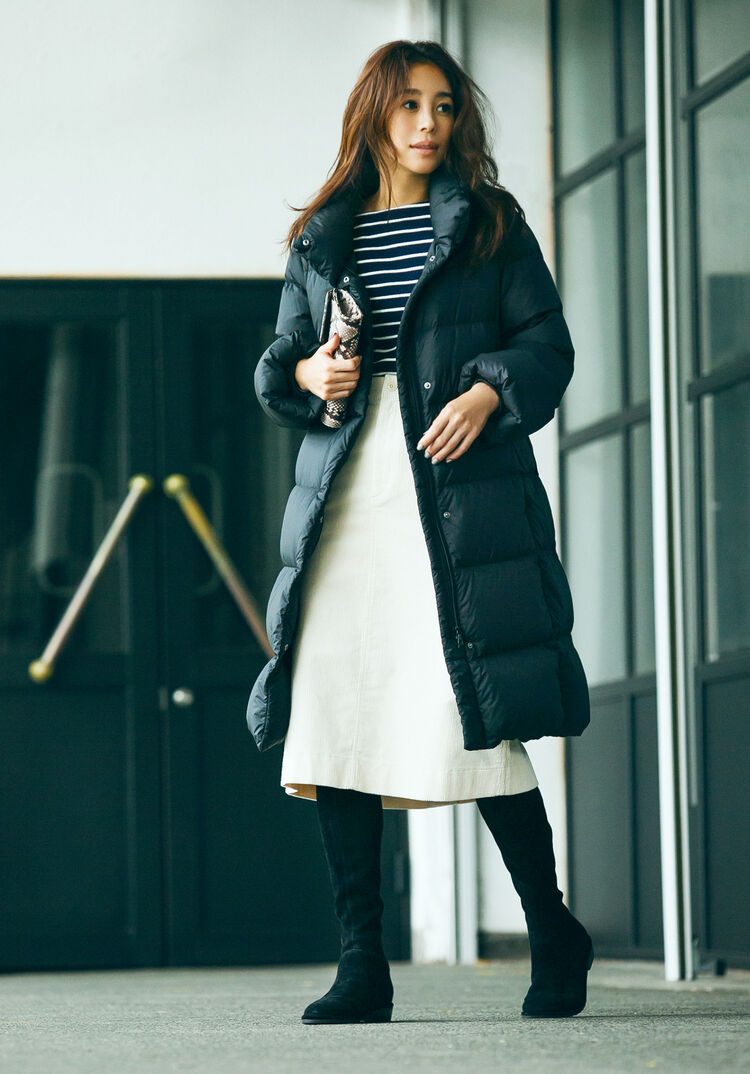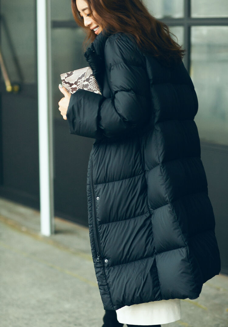 If you’re hesitant to wear down even though it’s cold out because you think down appears too casual for work or for a classy get-together with friends, then this seamless down coat is for you. Its sophisticated design keeps down’s casual feel out of sight. A stylish appearance is yours when you coordinate in black and white this season. Naturally, warmth is also yours because the coat extends past the hips.