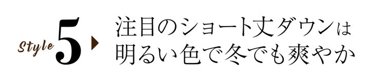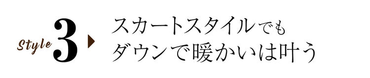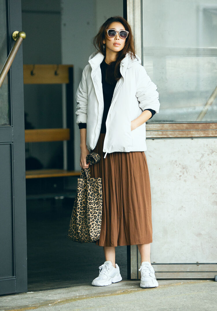 A casual-looking combination of a down parka and sneakers still gains a clean, respectable feel when you choose white and add a skirt to the mix. That’s all it takes to transform an arrangement of casual items into a dressy coordinate! Get this year’s look, too, by coordinating on-trend camel. Short down coats go great with both skirts and pants, so having one greatly increases styling options.