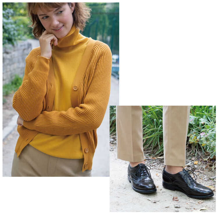 Perfect for early fall, the first coordinated look uses as the centerpiece these light beige ankle-length pants. On top of coming in a demure, solid color, they’re made of a wool-like fabric that’s soft and warm. Of the four featured, this model offers the greatest versatility. Consider coordinating it to this knit set and creating a clean-look, casual arrangement that’s perfect for stepping out in on a day off. The slightly different mustard tones of the set’s items foster both depth and style. Go with lace-up shoes to tighten the entire look. The bare ankles that peek out are enough to produce a laid-back air.