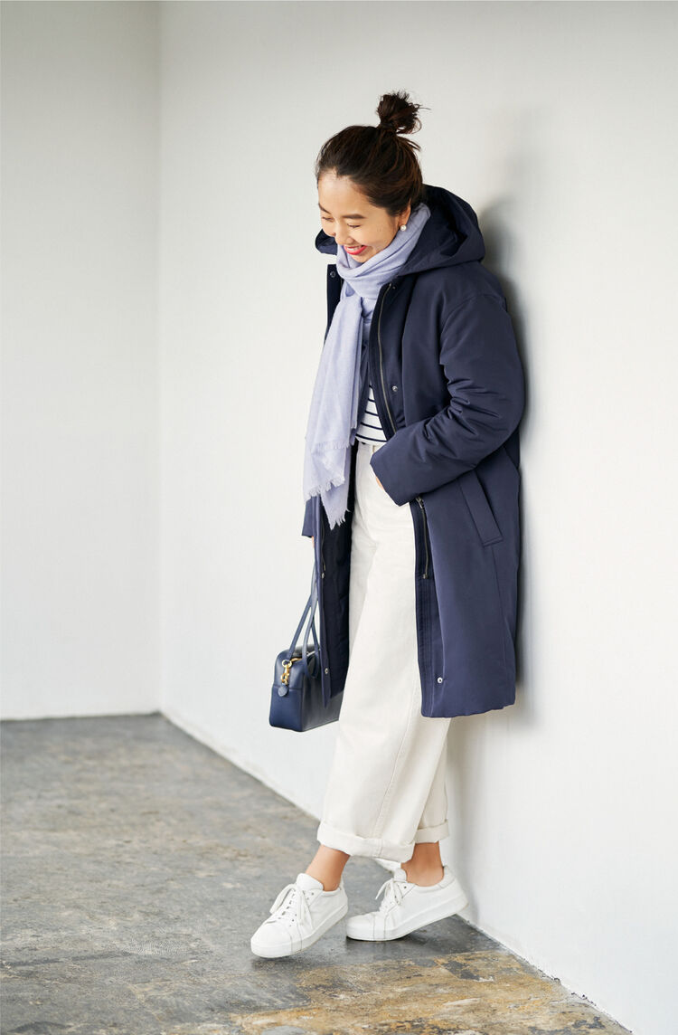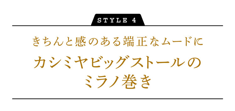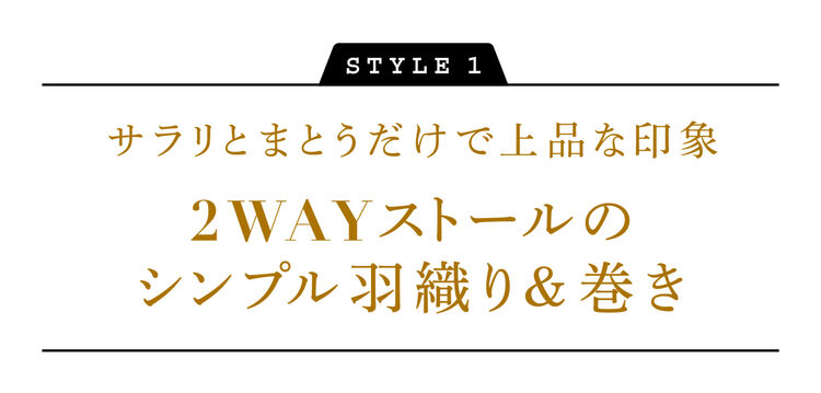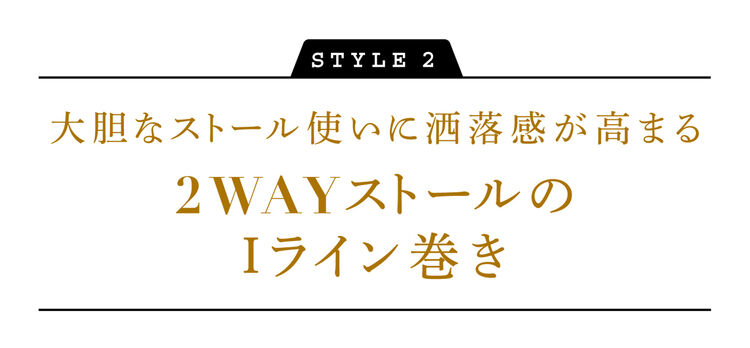 Take advantage of the 2-way stole’s large size, and make a straight vertical line by letting one end hang lower. This produces a stylish appearance, which goes great with dashing looks, like pants styles. You’ll love how the tie brings out the vertical silhouette to produce better-looking proportions as well.
