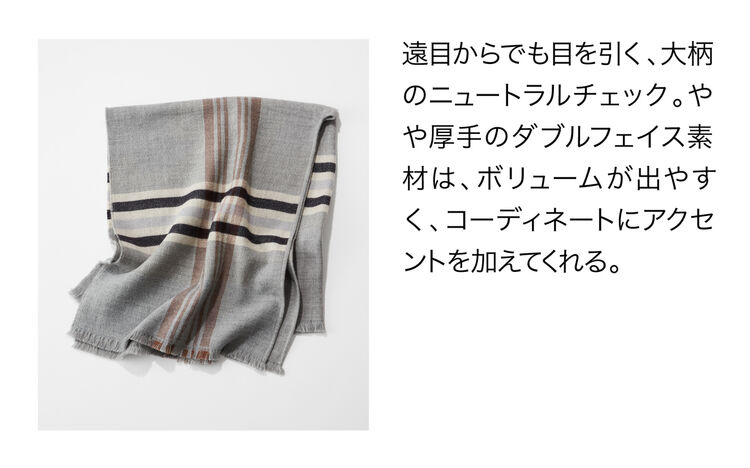 The large, neutral checks catch the eye, even from afar. The moderately thick double-face fabric easily produces volume and brings an accent to coordinates