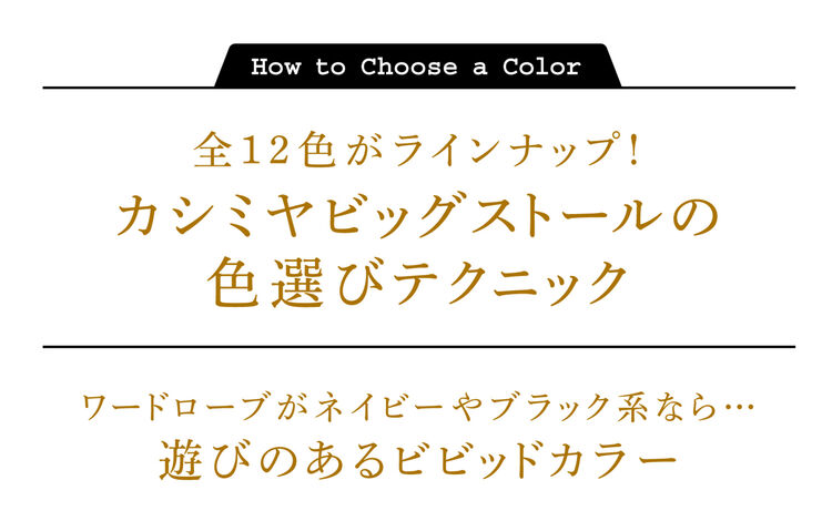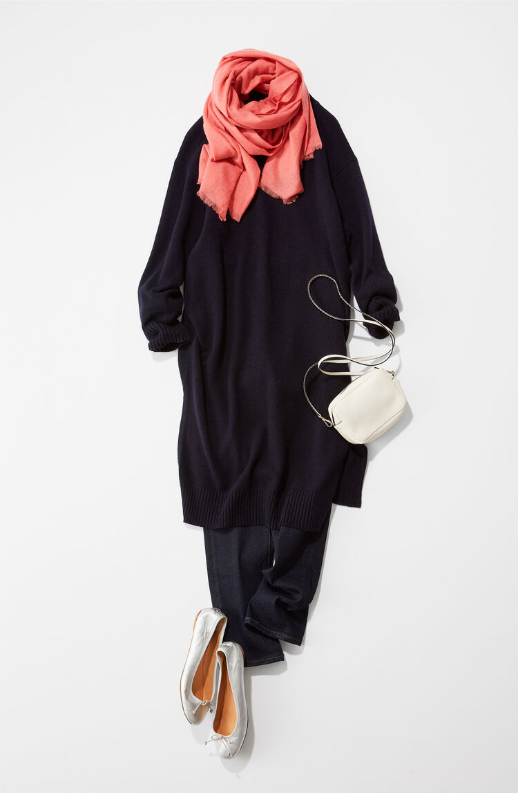 The cashmere stole comes in many colors, like red, yellow, and blue, in addition to pink. Stoles that are bold, vivid colors are easy to coordinate because they cover only a small part of coordinated looks. Use such colors as accent in dark-toned arrangements, like all-navy looks.