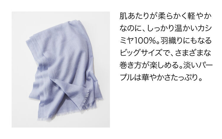 This stole feels great to the touch and is light, yet is warm because it’s 100% cashmere. Its large size lends itself to a variety of knots and even draping. The light purple model has a gorgeous appearance.