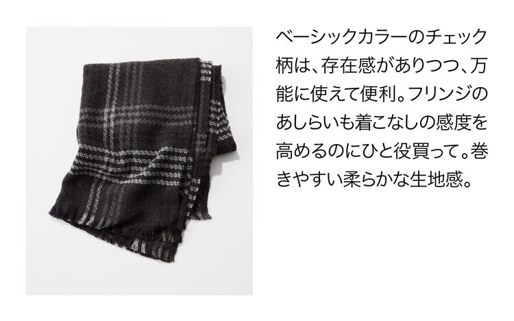 The plaid pattern of basic colors is bold, yet it’s also convenient due to its versatility. Use the fringes to bring a stylish feel to your looks as well. The stole’s fabric is soft to the touch and easy to tie.