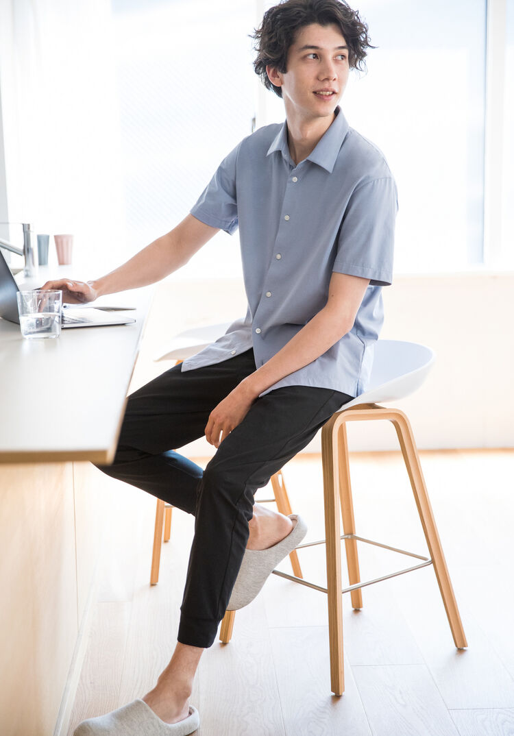 The first task of the day is a check of e-mails. You’ll want to choose super comfy pants when sitting down to work in front of a computer. These jogger pants are perfect for telework. Their ultra-stretch fabric freely stretches in all directions. They offer more than just great wear comfort. They confer a respectable feel even at home because their tapered silhouette engenders a trim appearance. Pair them to an AIRism polo shirt to complete a smart work look.