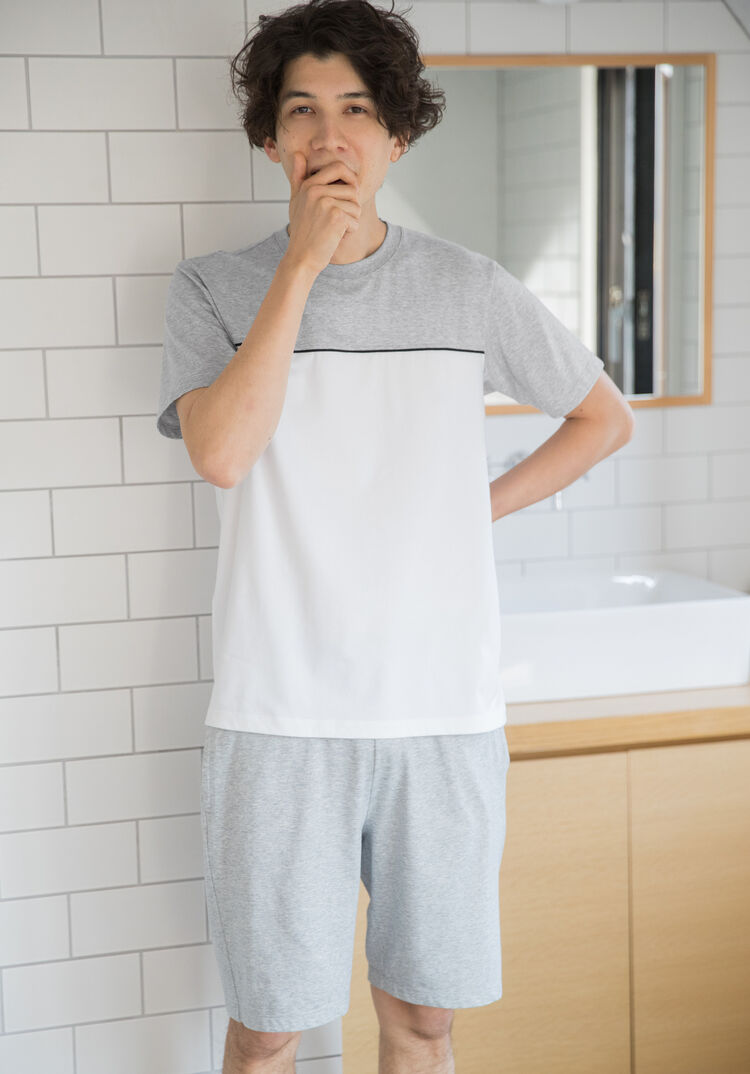 The AIRism cotton T-shirt has been immensely popular since its arrival this February. Its eponymous new fabric, which is cotton on the outside and AIRism on the inside, is a topic of excited discussion because it’s a prime example of how great functionality produces great looks. This set uses this fabric. AIRism’s DRY function wicks moisture and minimizes its buildup before that moisture can become perspiration stains on the cotton exterior. The fabric also has a Cool Touch feature that confers comfort throughout the year. There are three sets in all. A solid-color set and one with stripes printed on the chest are available in addition to the pictured set.