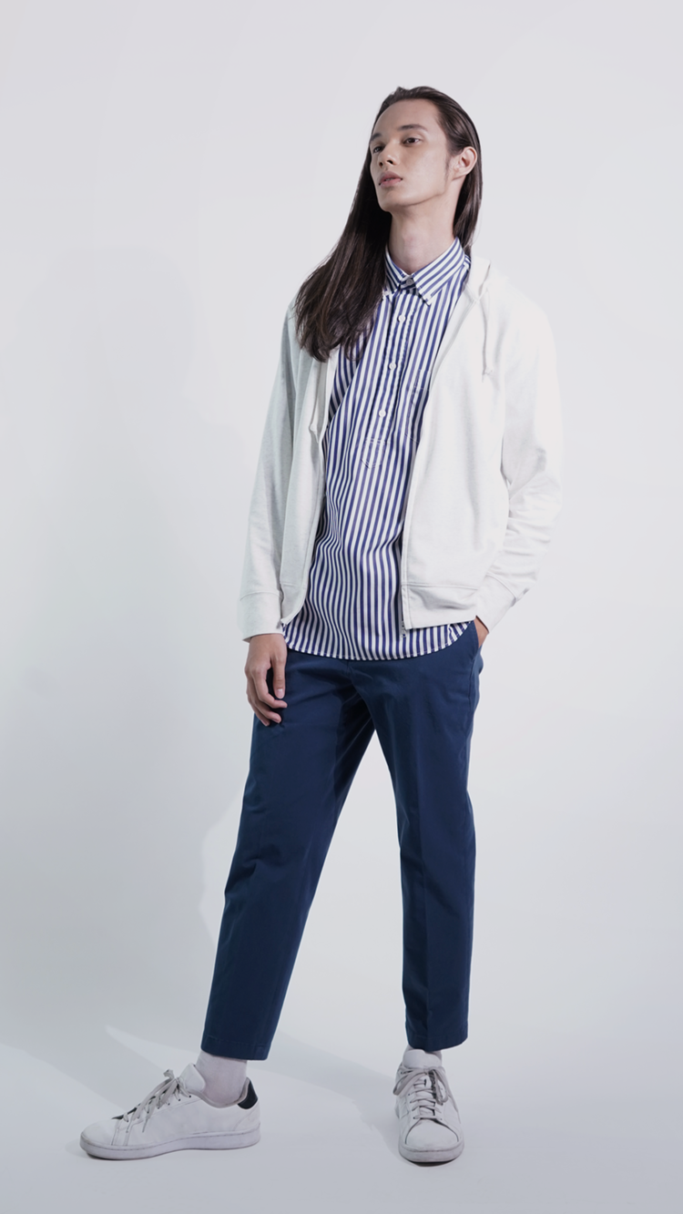 This look has functional pieces that create a very relaxed and stylish look for everyday occasions. The outerwear gives added UV protection while giving the whole outfit with the collared top a very soft, laid back feel. For something more casual, it can be paired with an AIRism Cotton T-Shirt.
