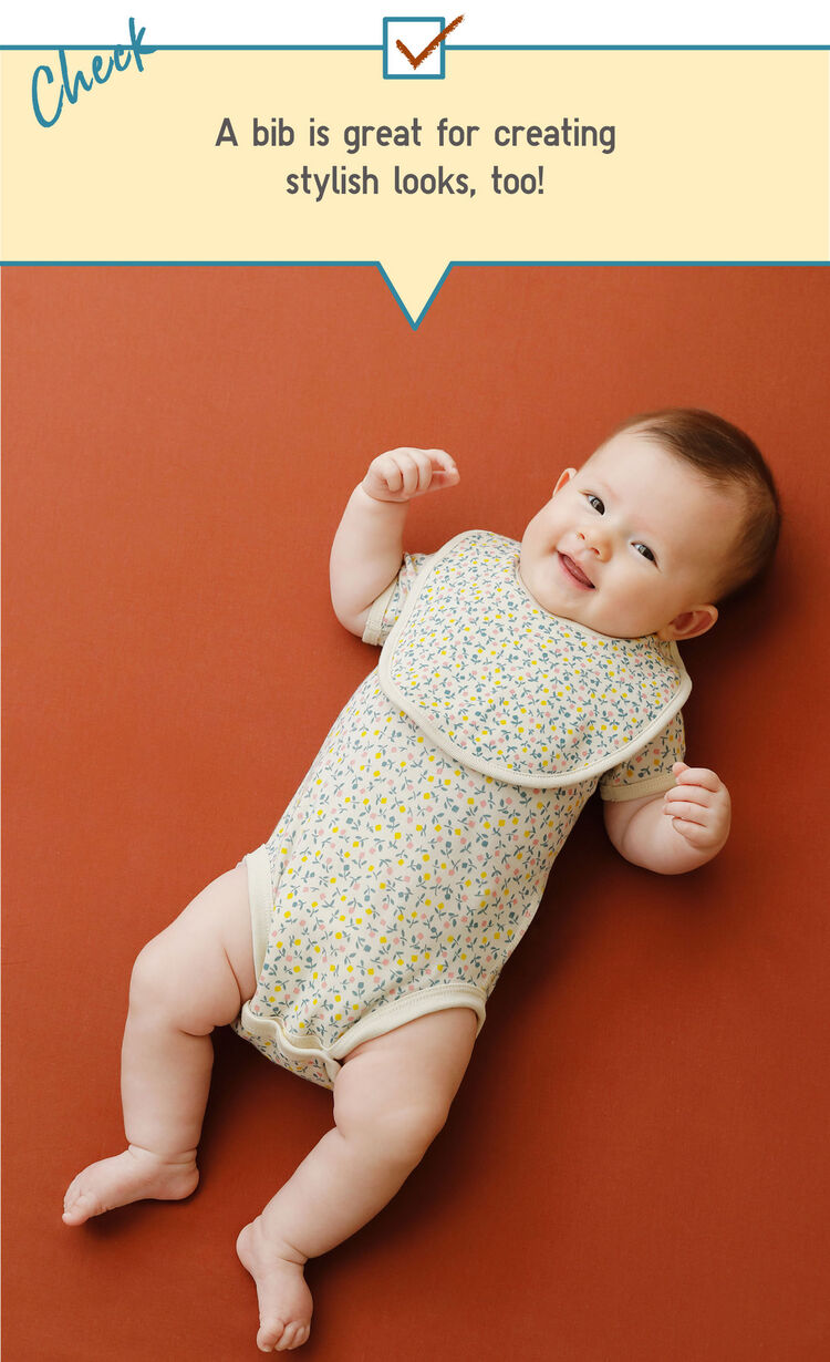 UNIQLO’s newborn innerwear, bodysuits, one-piece outfits, and bibs are available with the same patterns. Coordinates that are built around the same pattern look fine, but why not have a little fun by combining different patterns. Or add a solid-color to the mix. Bibs require frequent replacement throughout the day, so you’ll thank yourself when you prepare several sets of colors and patterns that are easy to coordinate.