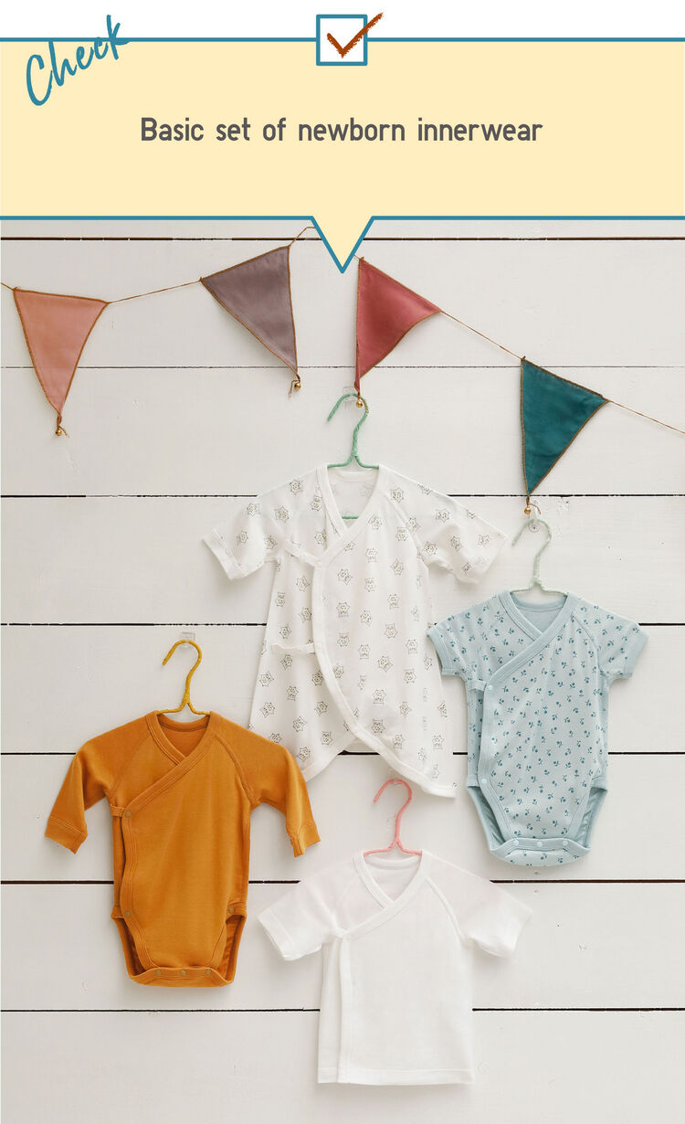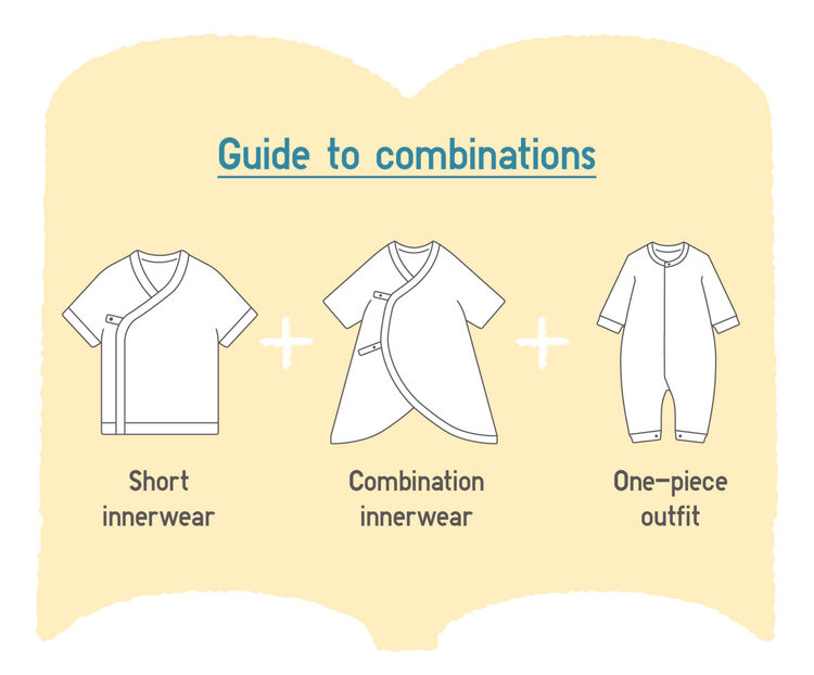 The short innerwear is worn directly over skin. It’s for wicking perspiration. The combination innerwear covers up to the legs. This is perfect for babies to keep a warm body temperature. Dress your baby in these two layers immediately after birth. Once your baby starts to energetically kick, you’ll want to replace the short innerwear with a bodysuit. There’s no need to worry about the opening because it fastens with buttons at the baby’s leg area. You’ll want to ready about five to six of each for perspiration and regulating body temperature because perspiration and spit-ups will require two to three changes a day.