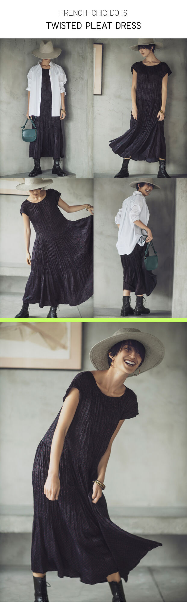 This French-chic dotted dress is also from the Ines de la Fressange Collection. It alone can produce a gorgeous appearance, thanks to its lustrous fabric and twisted pleats. Nonetheless, consider styling a shirt in the manner of light outerwear to make a crisp arrangement. The fabric also resists wrinkling even after an entire day of wearing the dress.