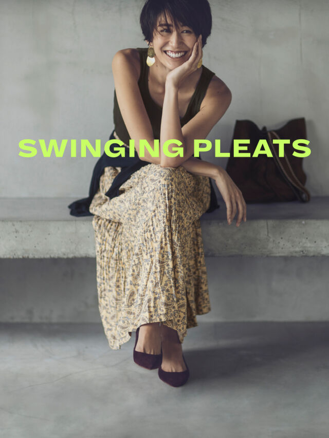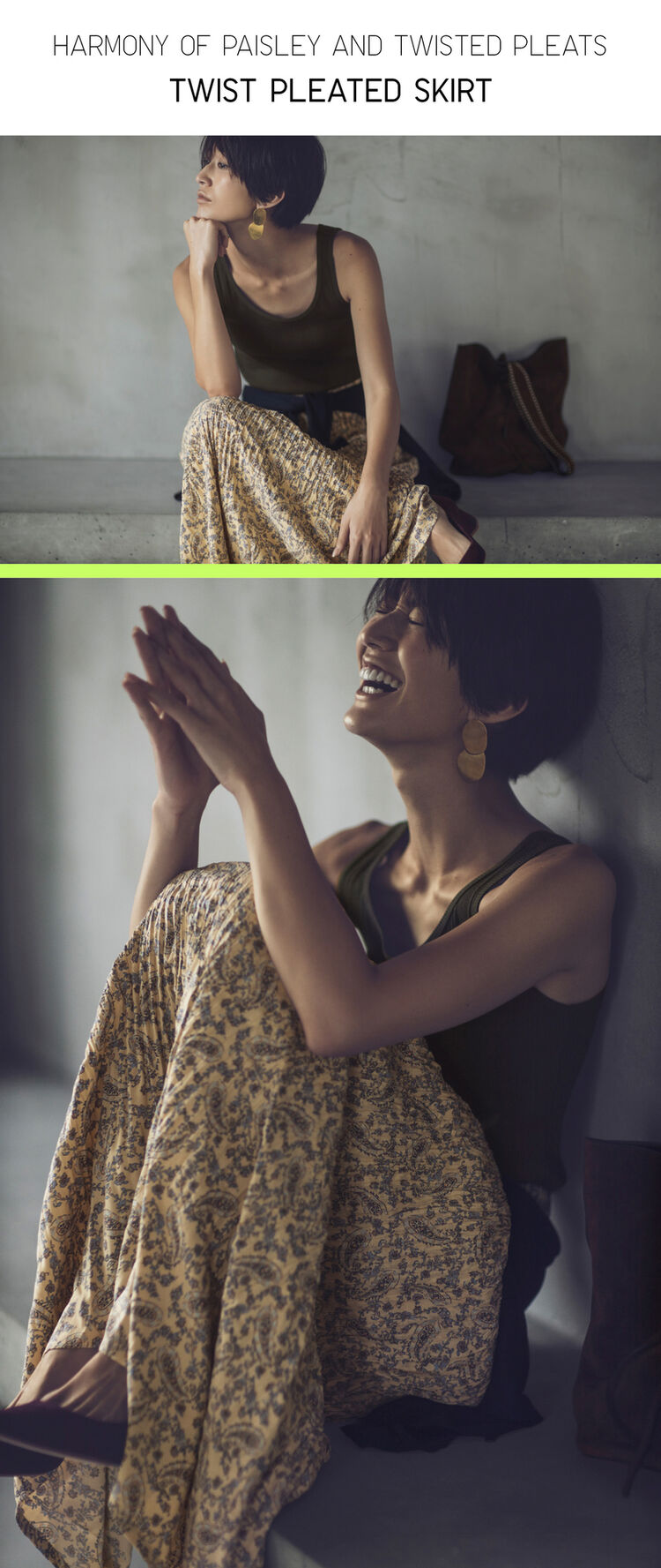 This fine paisley skirt is new this season and is from the collaboration with international supermodel Ines de la Fressange. The beige fabric is easy to pair with anything you feel to wear. Even if you mix and match this with different colored tops, in this case a dark green tank top and navy cardigan, looks stylish when this skirt is a part of the mix. You’ll also love how the twisted pleats bring out the vertical line from the design.
