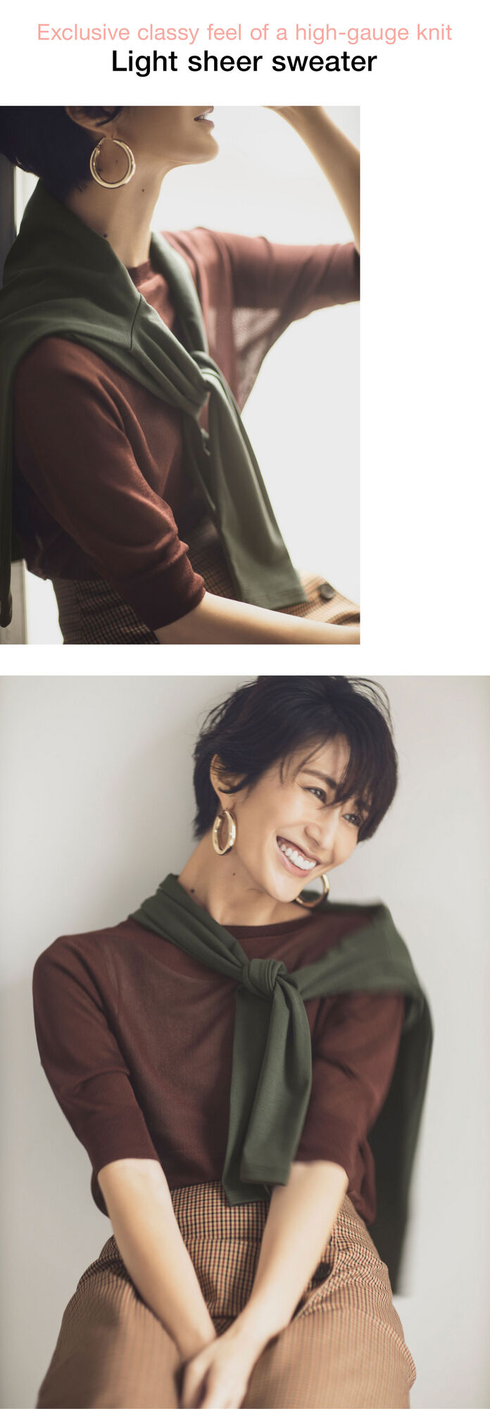 This sweater features amazing quality of a silky texture and high gauge knit that create a luxurious look and feel. It appears cool as well, so you’ll be frequently turning to it at any time of the year. For the inner layer, choose a plain tank top, and let it peek out from underneath. Coordinate a wine red, gun club check skirt to get a trad look and a head start on fashion.