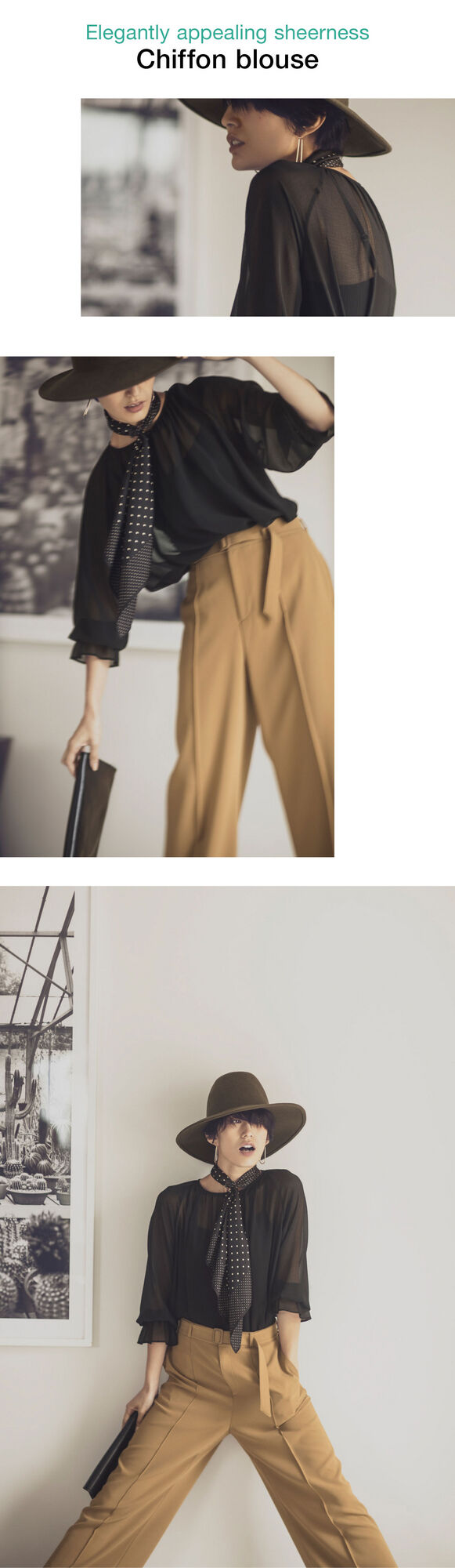 You’ll want to match this chiffon blouse and its sheer quality to a black camisole Bra Top in a chic way. The blouse has a decidedly feminine feel, so consider styling it with these masculine, center-creased wide-leg pants. Wrap a dotted scarf in the manner of a tie to complete a stylish arrangement for a balanced look.