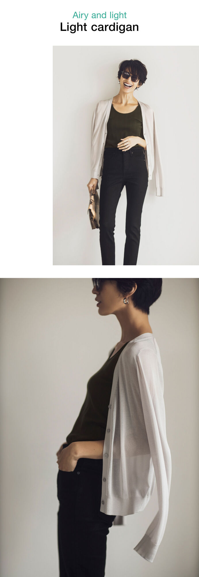 This cardigan remains popular because it’s cool, it’s clean looking, and it’s light. The secret is a knit that uses special rayon material. This is one item you’ll be slipping into for a long time because it’s perfect for throwing on in air-conditioned offices and cafes. Just coordinating even this classic light gray model in a cool, breezy manner instantly updates your regular arrangements!