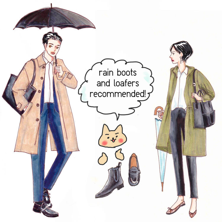 The outerwear worn in the business scene must match a beautiful style such as a suit. The men's bal collar coat is not only simple in design and can be turned on or off, but also has a durable water repellent function, so you can rest assured that it will repel light rain. A long pocketable coat is also recommended for ladies. Although it is a casual design, it is easy to match with work clothes if it has a calm color, and it also has a durable water repellent function. When not in use, it is convenient because you can put it in the attached pouch and put it in your bag. When it rains all day long, take measures such as short-length rain boots and rain loafers that are easy to match with the business scene and take measures against rain at your feet.