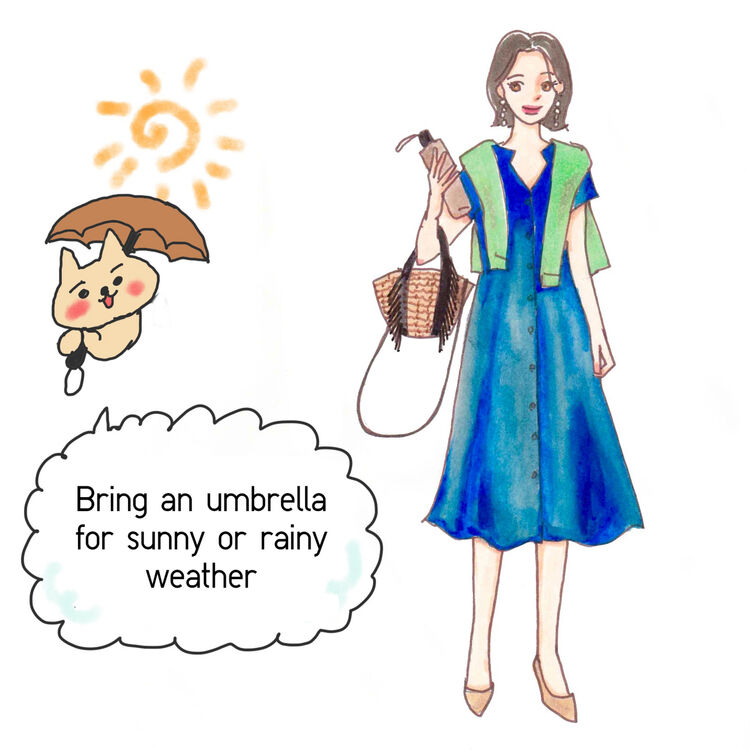 If you want to go out and enjoy fashion but it's raining, we recommend midi-length items that aren't too long and don't bother with water and mud splashing. The supple and elegant rayon dress has a fluffy A-line silhouette and is gorgeous, making it perfect for a beautiful style. If you wear a bright-colored cardigan on your shoulder, it will not be too simple and will give you a sharp look. If you have a folding umbrella that can be used for both sunny and rainy weather, you can handle not only UV protection but also some rain, so you can rest assured that the weather will change suddenly.