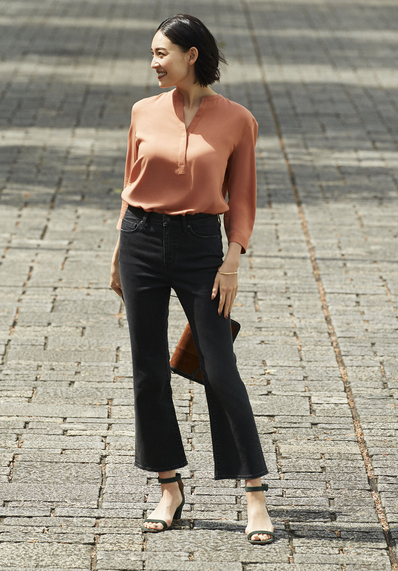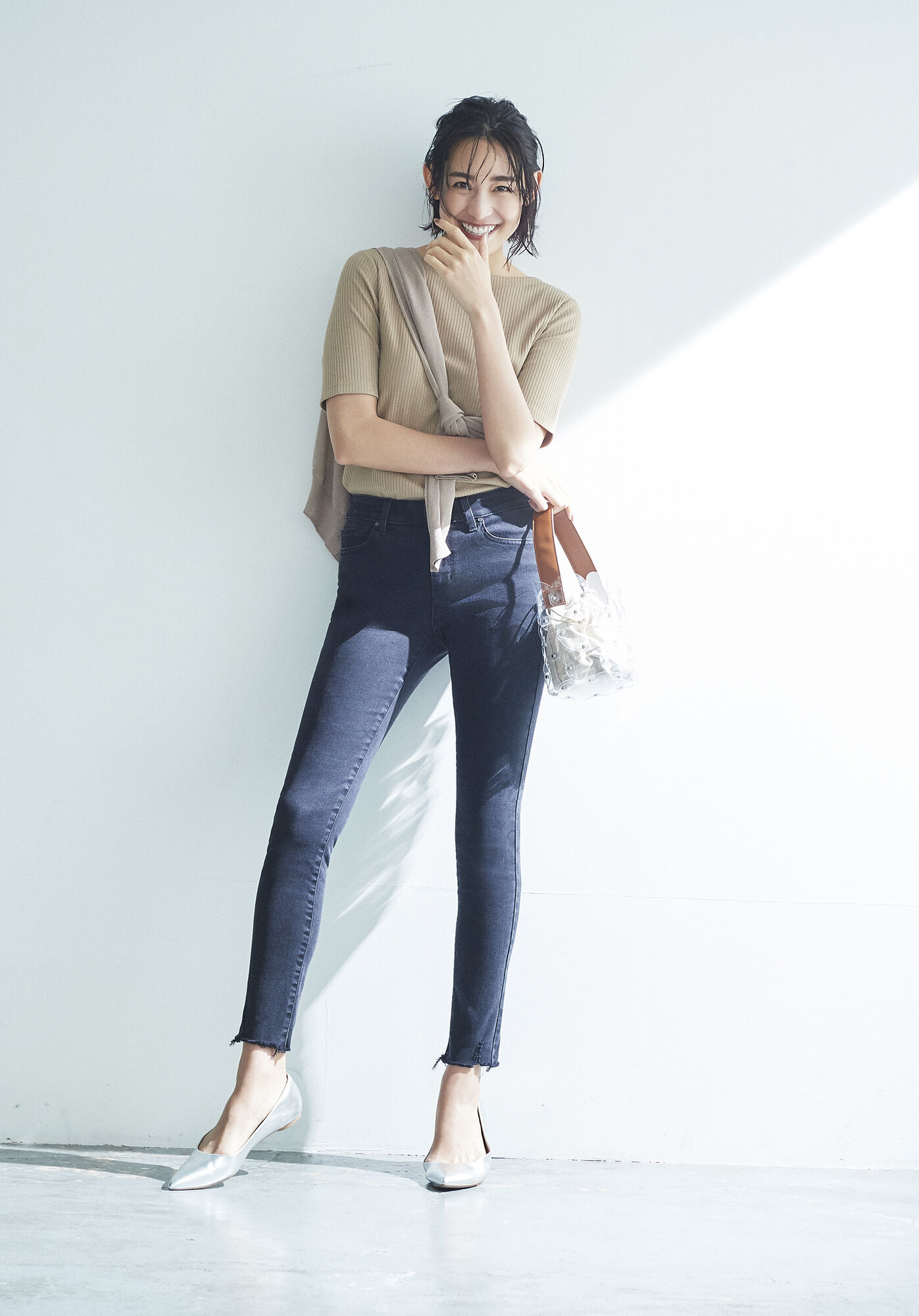 “These jeans’ cut-off hems balance out the respectable feel of the item’s dark color to confer a stylish appearance. I consolidated the tops in the single color of beige. These slender jeans produce longer-, beautiful-looking legs. However, consider keeping the top half snug as well to produce an attractive, slender silhouette.”