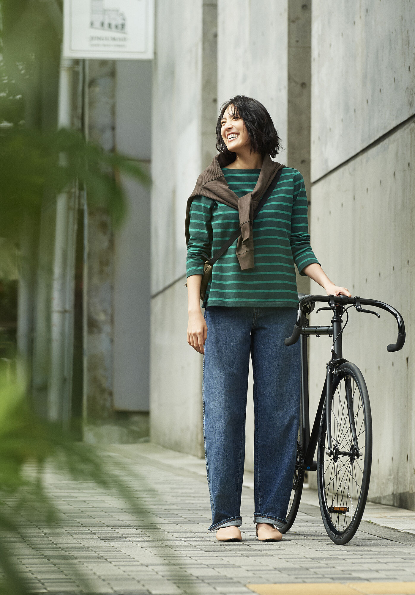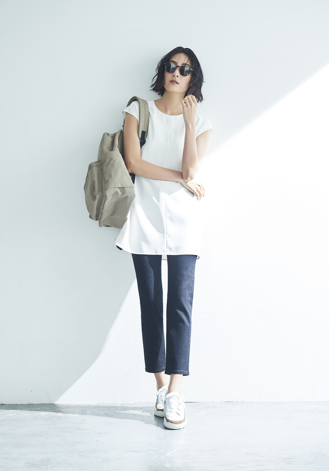 “Built around the jeans’ dark indigo, this monochrome coordinate ranges from navy to blue. Create a beautiful and long “I” line silhouette with the tucked in navy top and the jeans. You’ll gain a loose, airy feel and a much more sophisticated appearance when you layer a big shirt over top in the style of a jacket.”