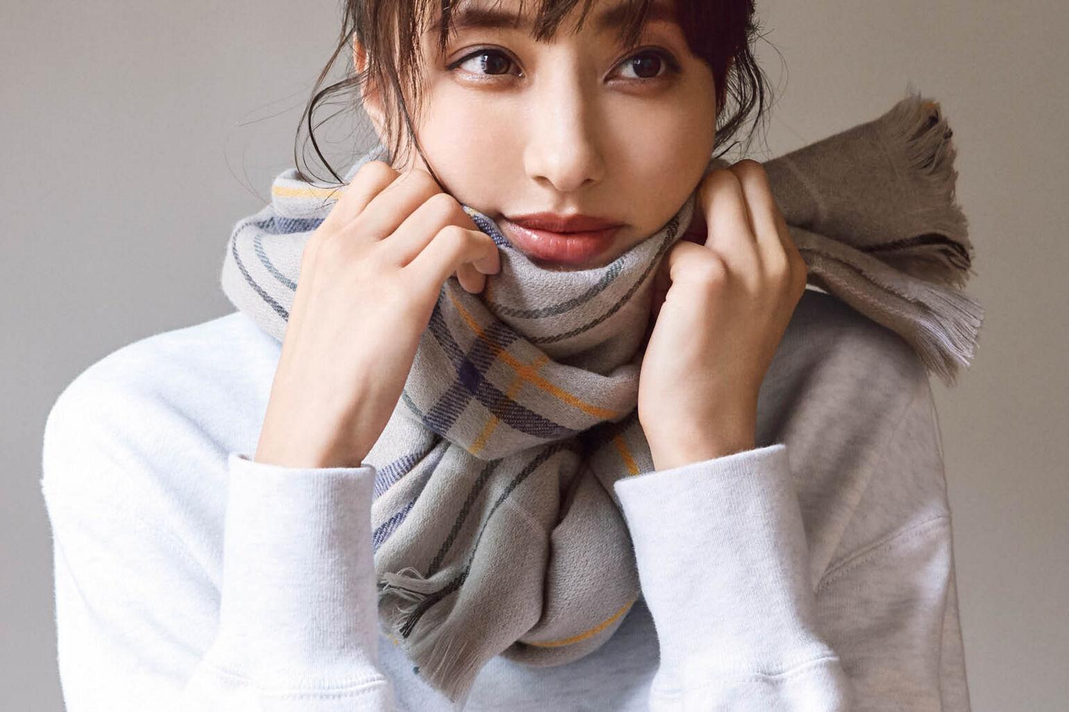 Even a simple coordinate consisting of a sweatshirt and corduroy pants turns into a dazzling fall statement when just a plaid stole is added to the mix. Fold the stole at a third of the way and then again before winding it around your neck. The resultant volume will foster a trimmer, smaller-looking face. A light gray model should help to create a lighter, gentler visage.