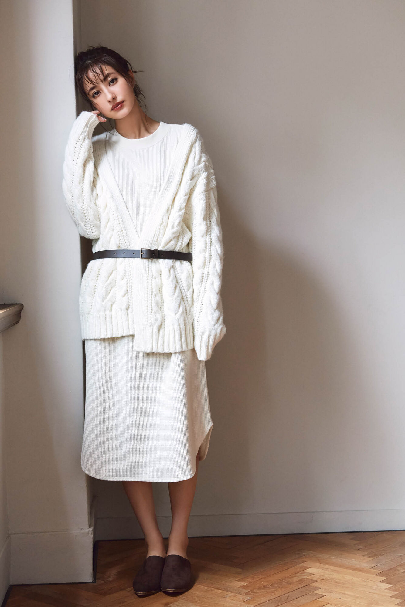 This all-white coordinate sees a cable knit cardigan over a waffle-fabric dress. Create a contemporary arrangement by casually wrapping a belt over the loose cardigan and bringing a natural narrowing to the silhouette. Slightly stagger the hem to foster a stylish accent as well.