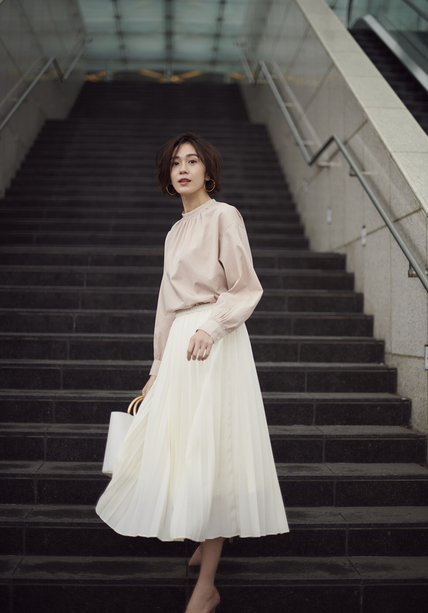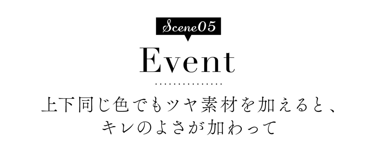 “Ensembles of similar items are convenient because they allow for quick and easy coordinates even when you’re short on time. However, there are times when a slightly showier look is desired, like special events. At such times, choose the same color but different fabrics. A fabric that’s handy is one that has a gloss like this skirt’s. You’re sure to get an ideal amount of contrast.”