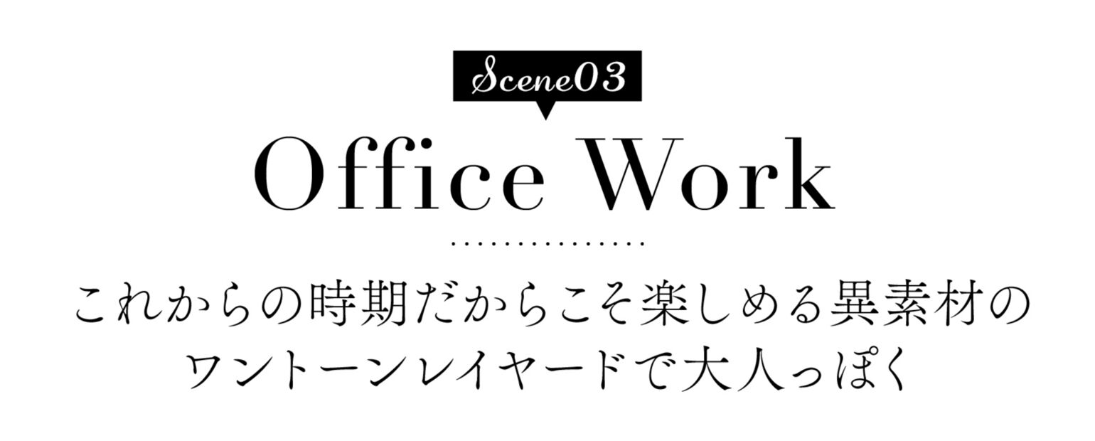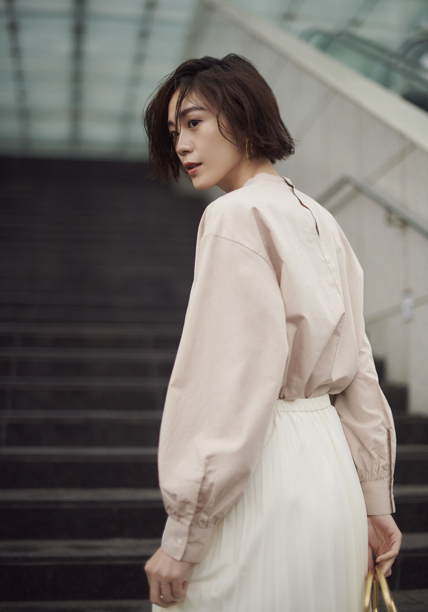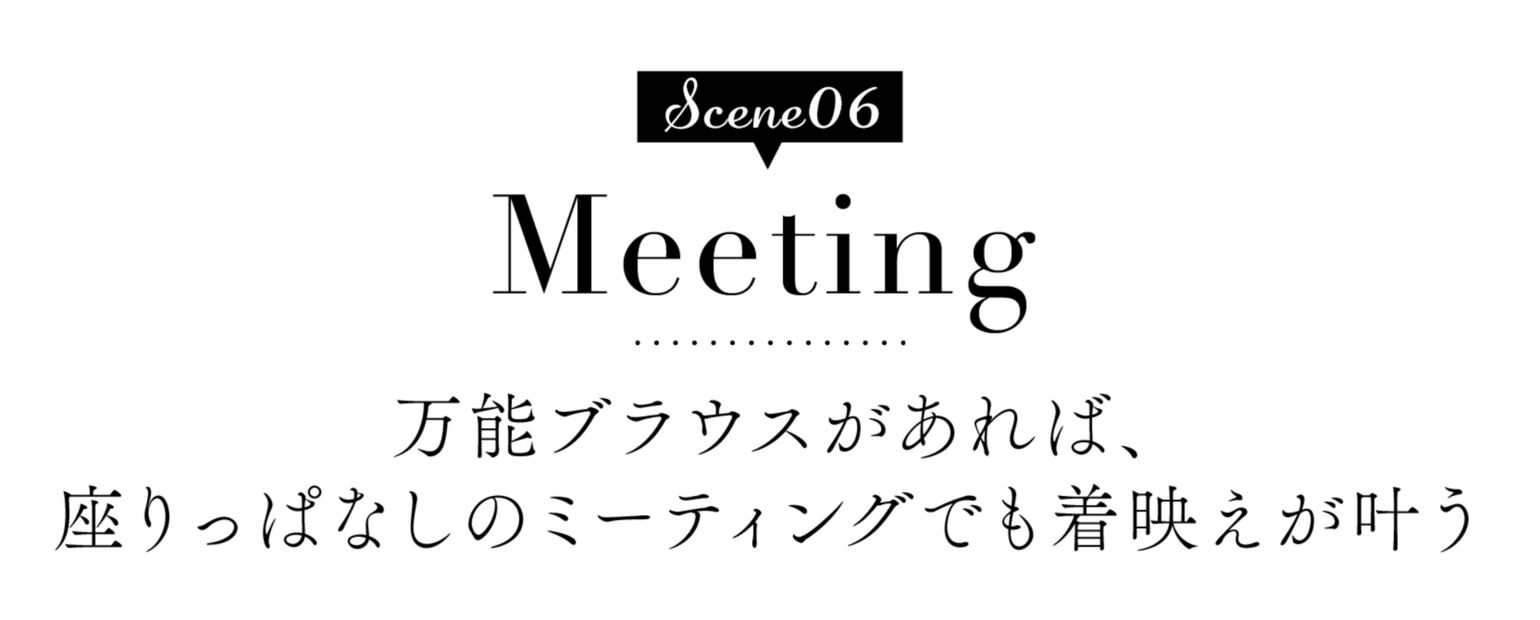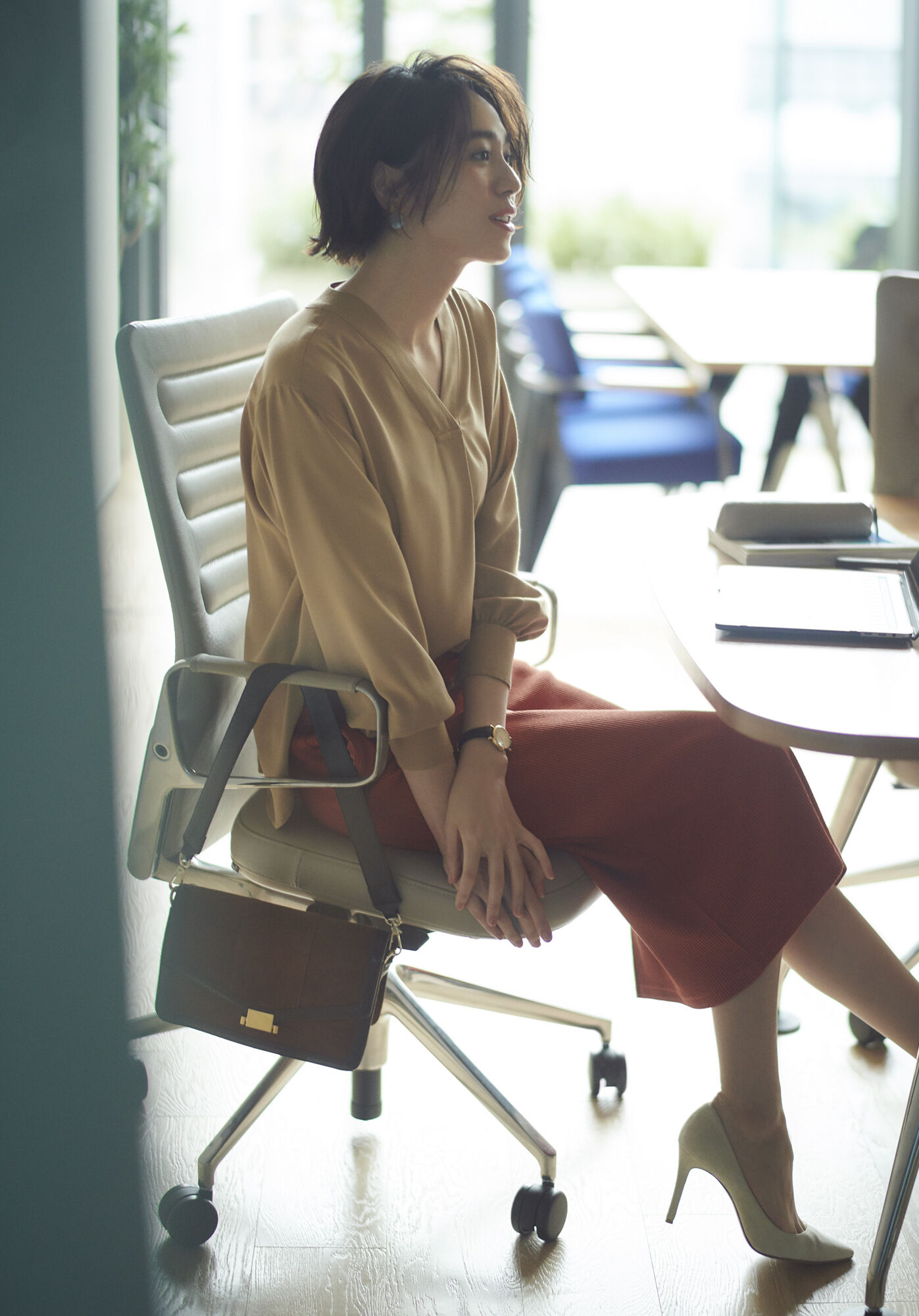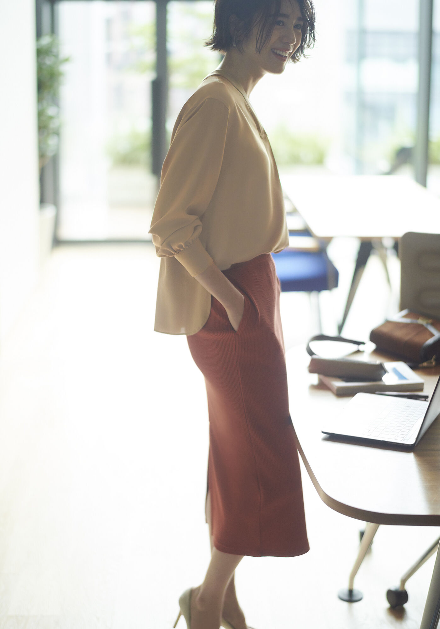 “Seated meetings are frequent when working at an office, so attention is inevitably drawn toward the speakers’ faces. That’s why you’ll appreciate a blouse that’s made of a drape fabric and has voluminous sleeves. Pair the blouse to a sharp, tight skirt to complete this classic office coordinate, which I recommend. The item is easy to care for as well because it resists wrinkling and can be laundered at home. You’ll love the blouse’s practicality, too. It can be tucked in or left out, and it doesn’t catch when worn under a jacket.”