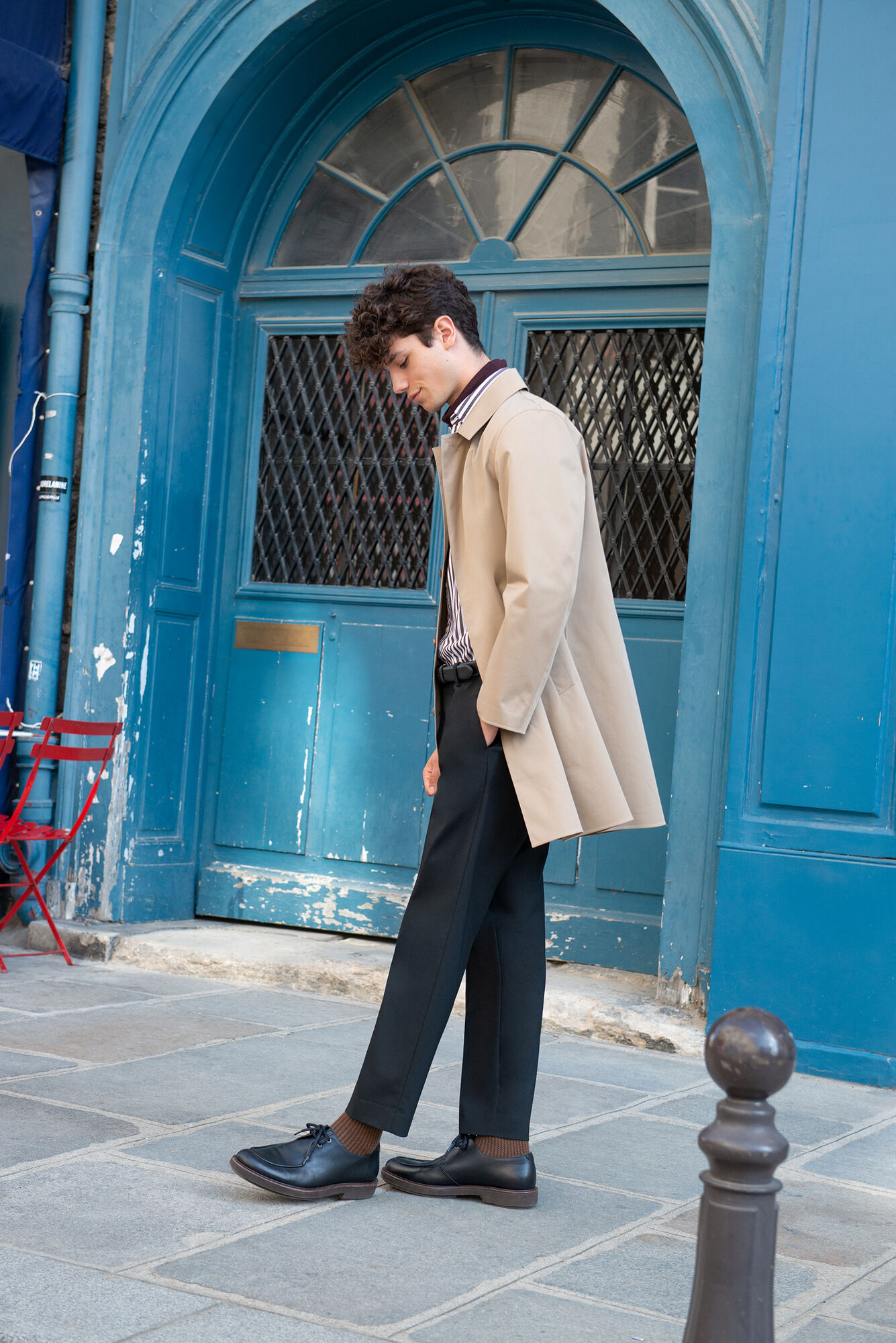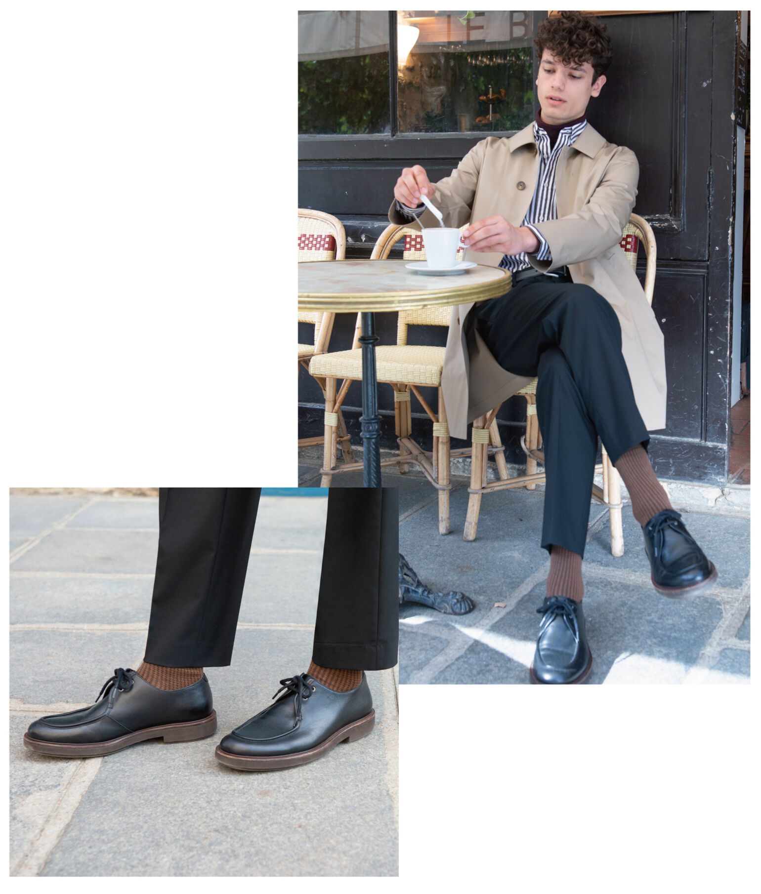 These ankle-length pants lend themselves to year-round use because they’re made of cotton. This dark olive model goes great with this Chesterfield coat whose brown is a notch brighter. A coordinated look that brings out the ankle-length pants’ relaxed fit is yours when you opt for tops with slim cuts and keep the top half tight and sharp. Be particular about the details, like letting a shirt peek out from under the sweater’s neck opening and the socks, from over chukka boots.