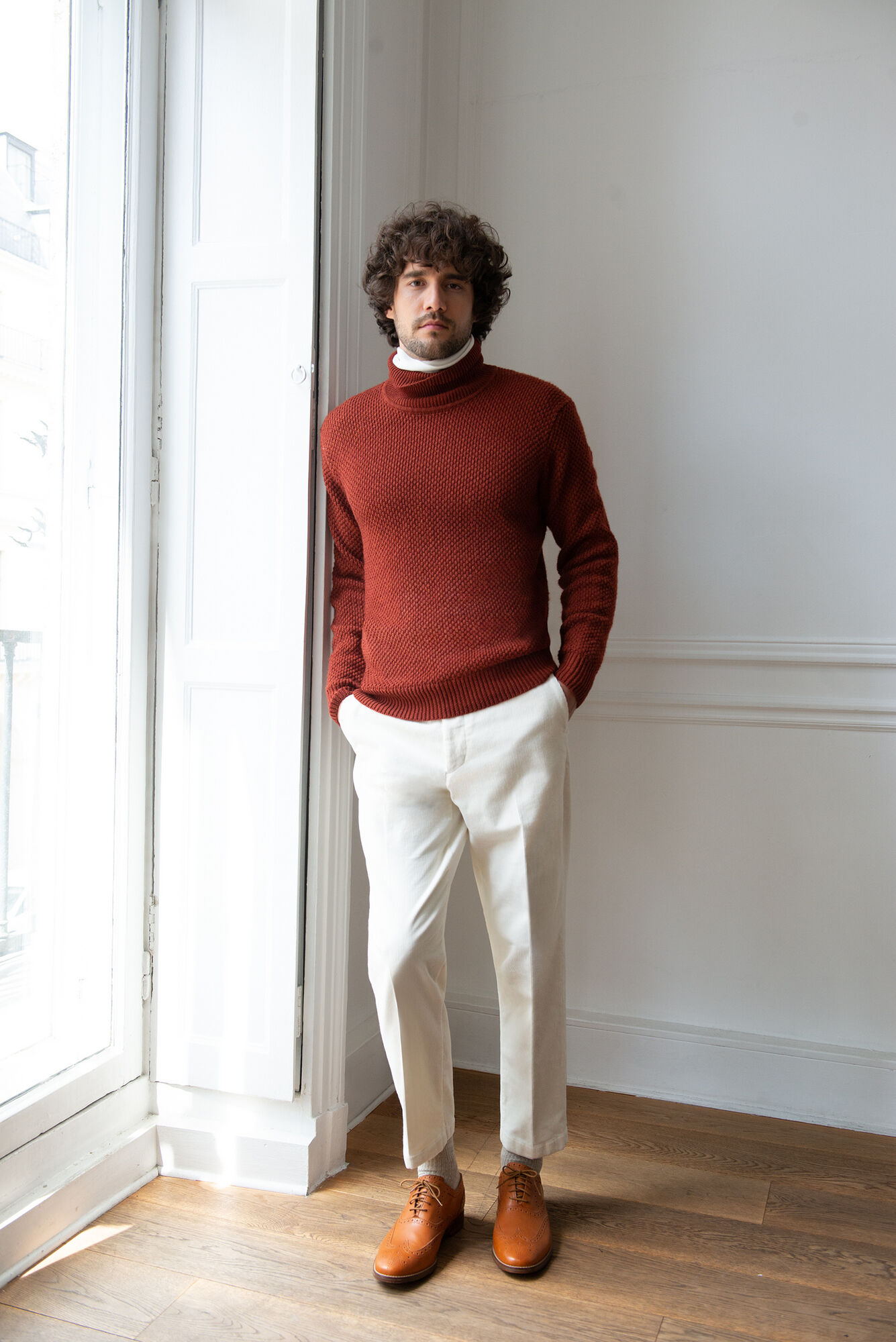 These corduroy ankle-length pants have a chunky look to them, owing to moderately wide wales. They’re super comfortable as well because their fabric offers generous levels of stretch. Consider combining warm-looking fabrics by pairing the pants and this middle-gauge sweater. Produce a chic appearance by coordinating light brown wingtips and nuance-color socks to the winter-white ankle-length pants.