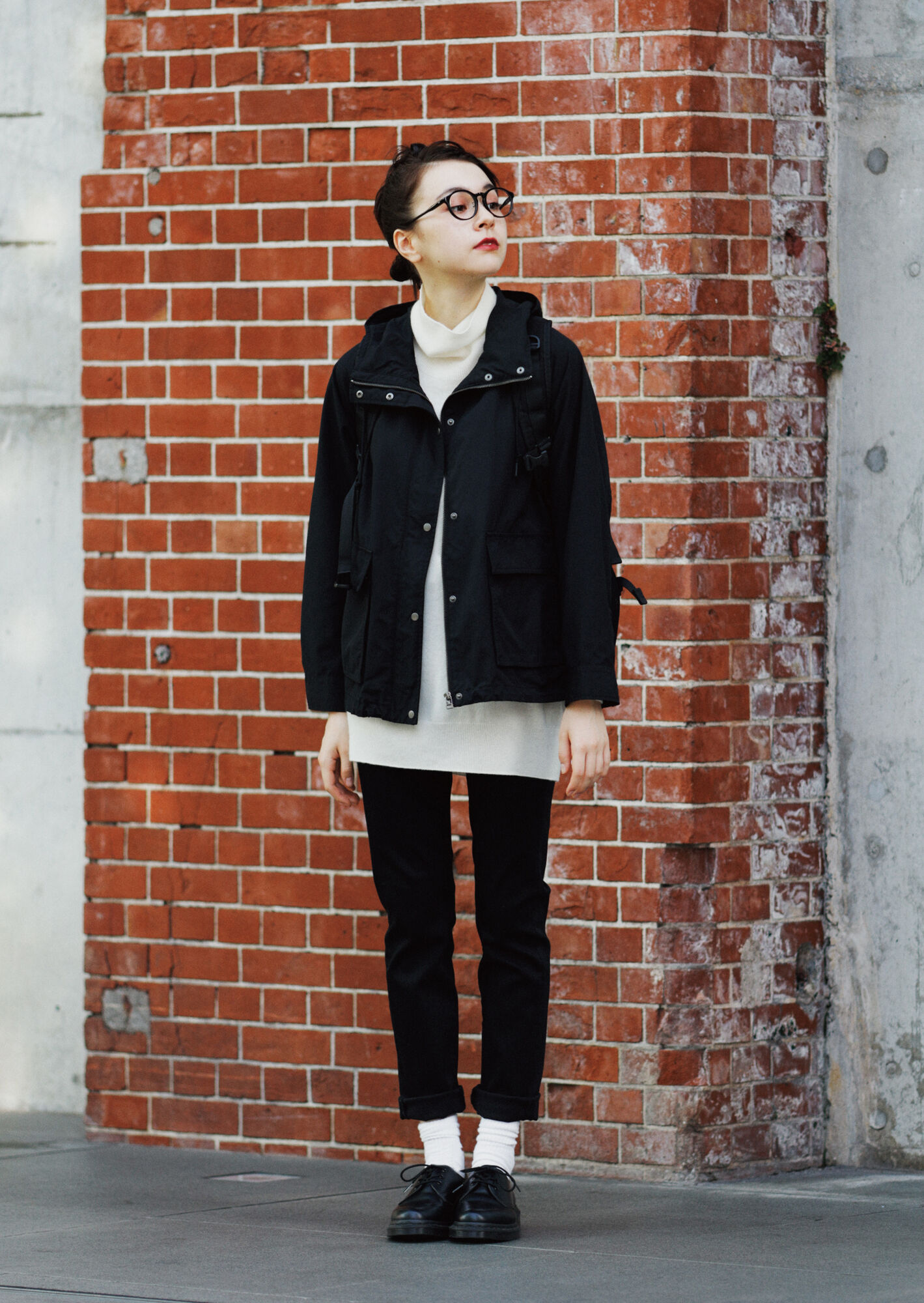 This down vest is warm, yet light. Add depth to the coordinate by slipping a waffle tee under the sweater that the vest is over. Then bring in a corduroy skirt to produce a fabric mix that’s only possible in fall. Midwinter, consider layering with a zip-up hoodie or a jacket.