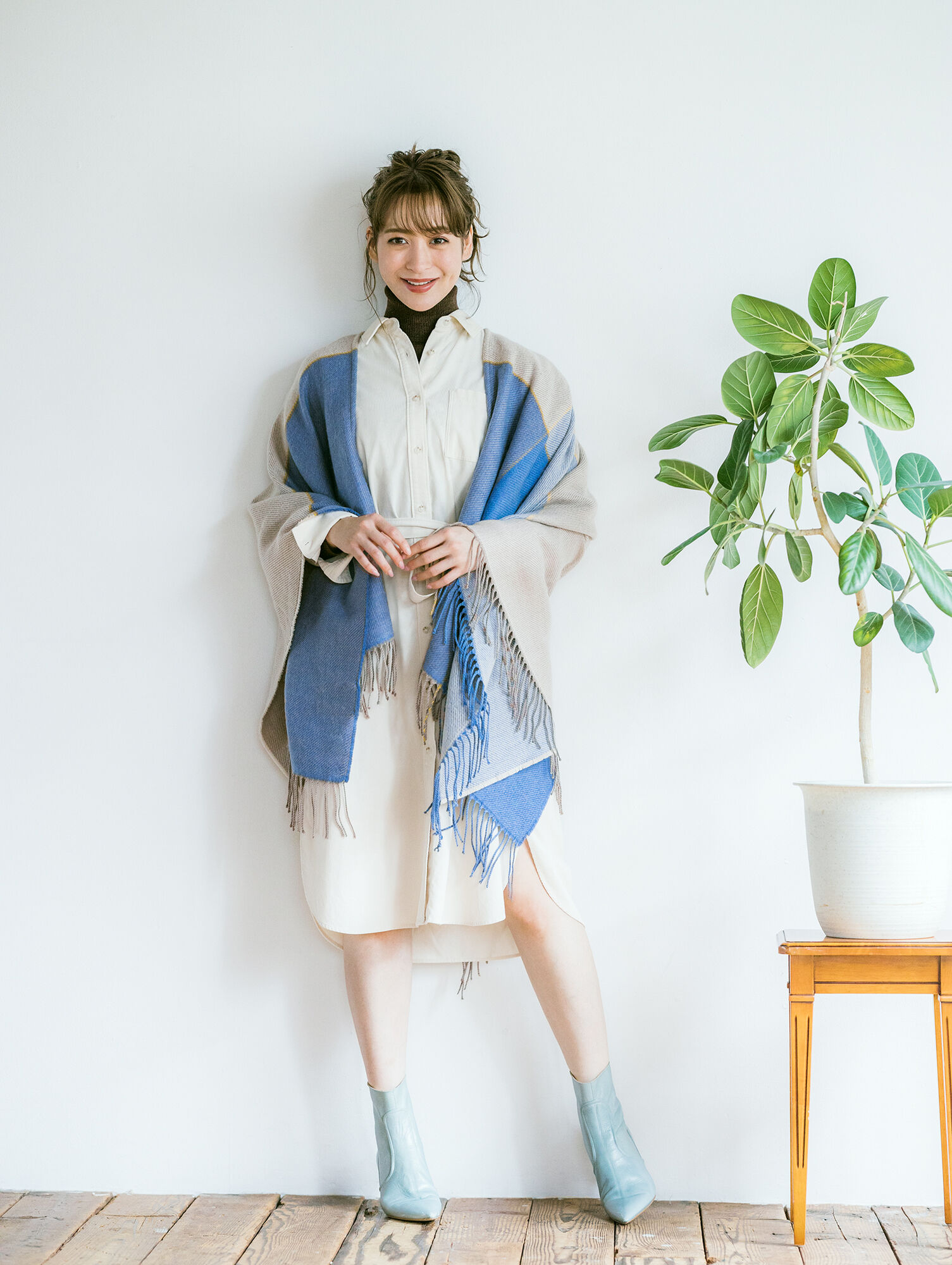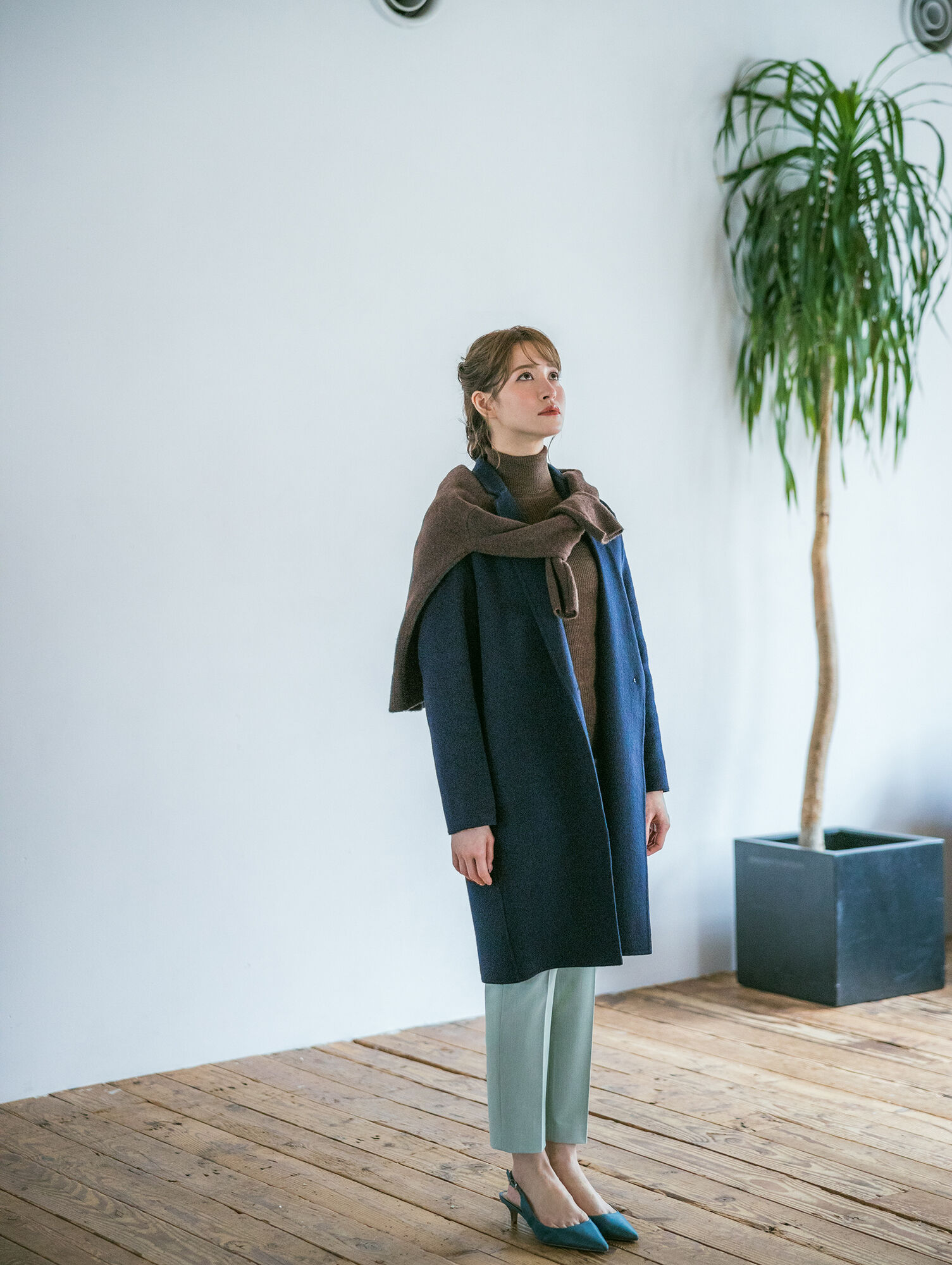 This coordinate has a contemporary feel, owing to its brown and mint color combination. Create a clean, straight form with this cocoon coat and these ankle-length pants. Then, foster volume around the upper body by draping the sweater over your shoulders. This is an expert technique that you’ll want to come back to. The layering of browns also sets this arrangement above the rest.