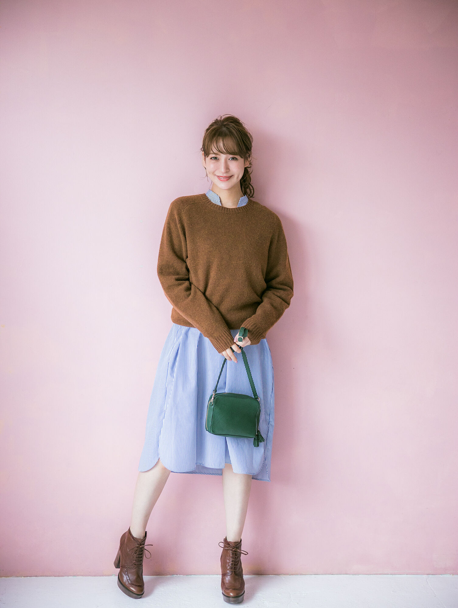 Start with a shirt dress. Then balance out its dressy feel and go more casual by layering a sweater over top. The dress also increases styling options because it can be worn in the manner of a skirt. Coordinate the lower items in brown. Then use a small bag as an accent in this season’s style.