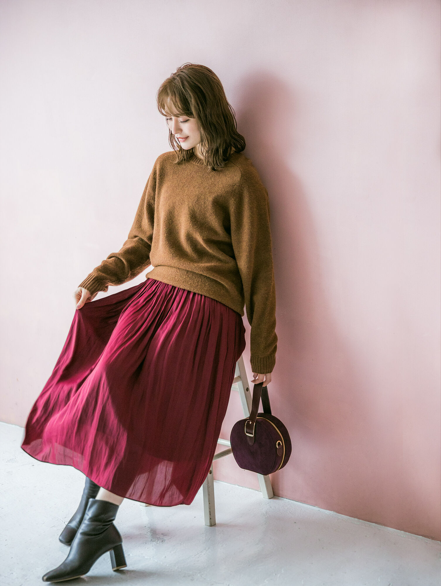 This premium lambswool crew neck sweater is made of soft, high-quality lambswool as the name suggests. Adding a men’s model to the mix confers a relaxed silhouette and a laid-back feel. Combine this deep brown and wine red to complete a look that oozes a seasonal flavor. Then take the look’s feminine feel to the next level with this airy gathered skirt.