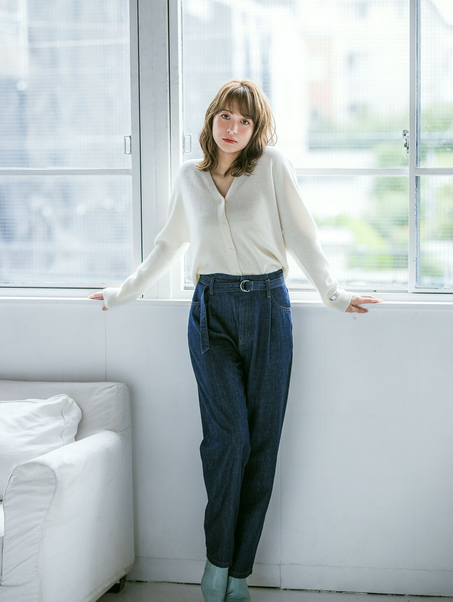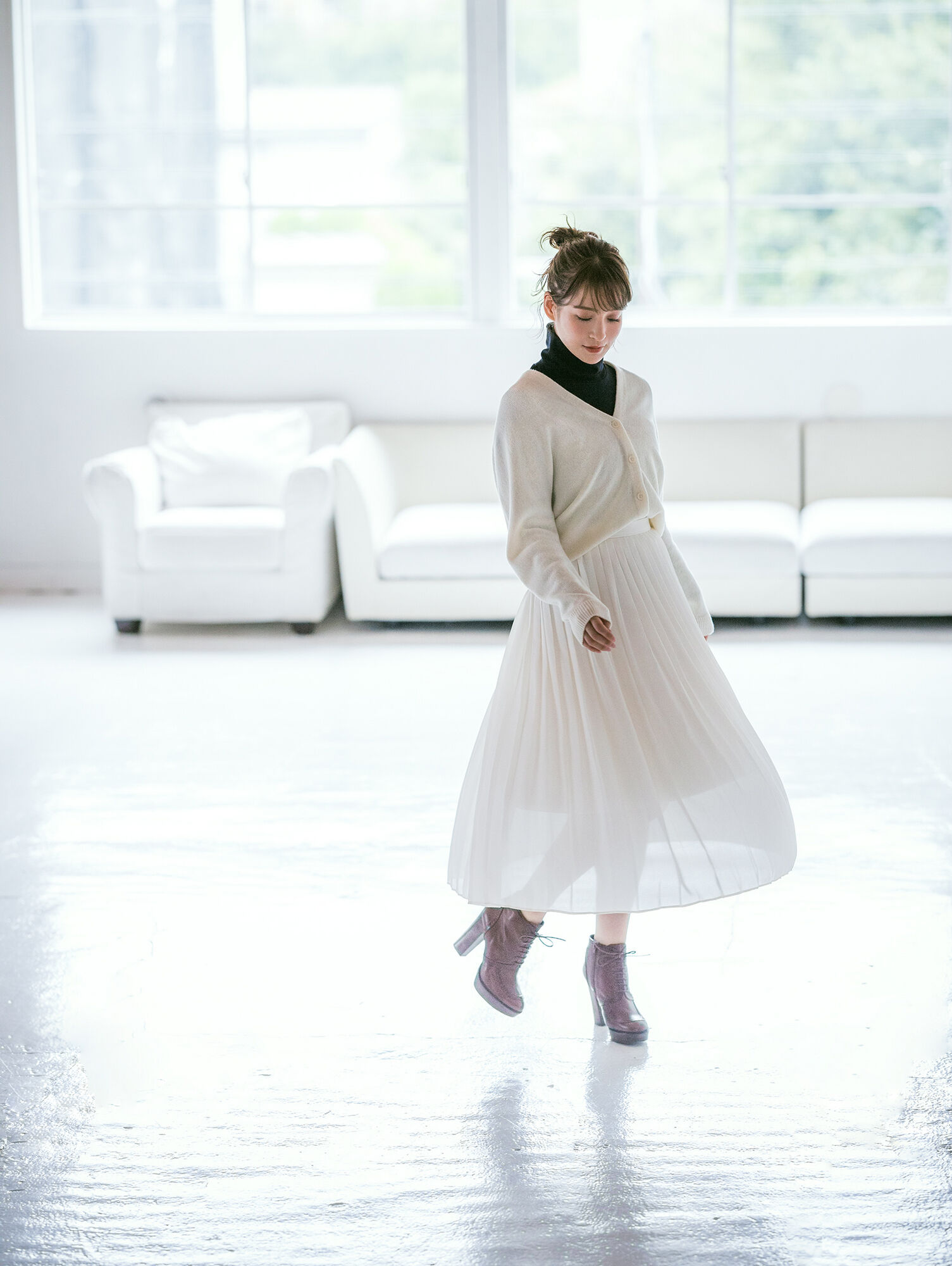 An elegant arrangement results when you wear the cardigan in the manner of a sweater and coordinate a respectable pleated skirt. Even when a turtleneck is slipped in underneath, the appearance around your face remains trim and clean because the cardigan’s wide V-neck opening fosters a laid-back feel. When you want a chicer appearance, let the nape droop a little.