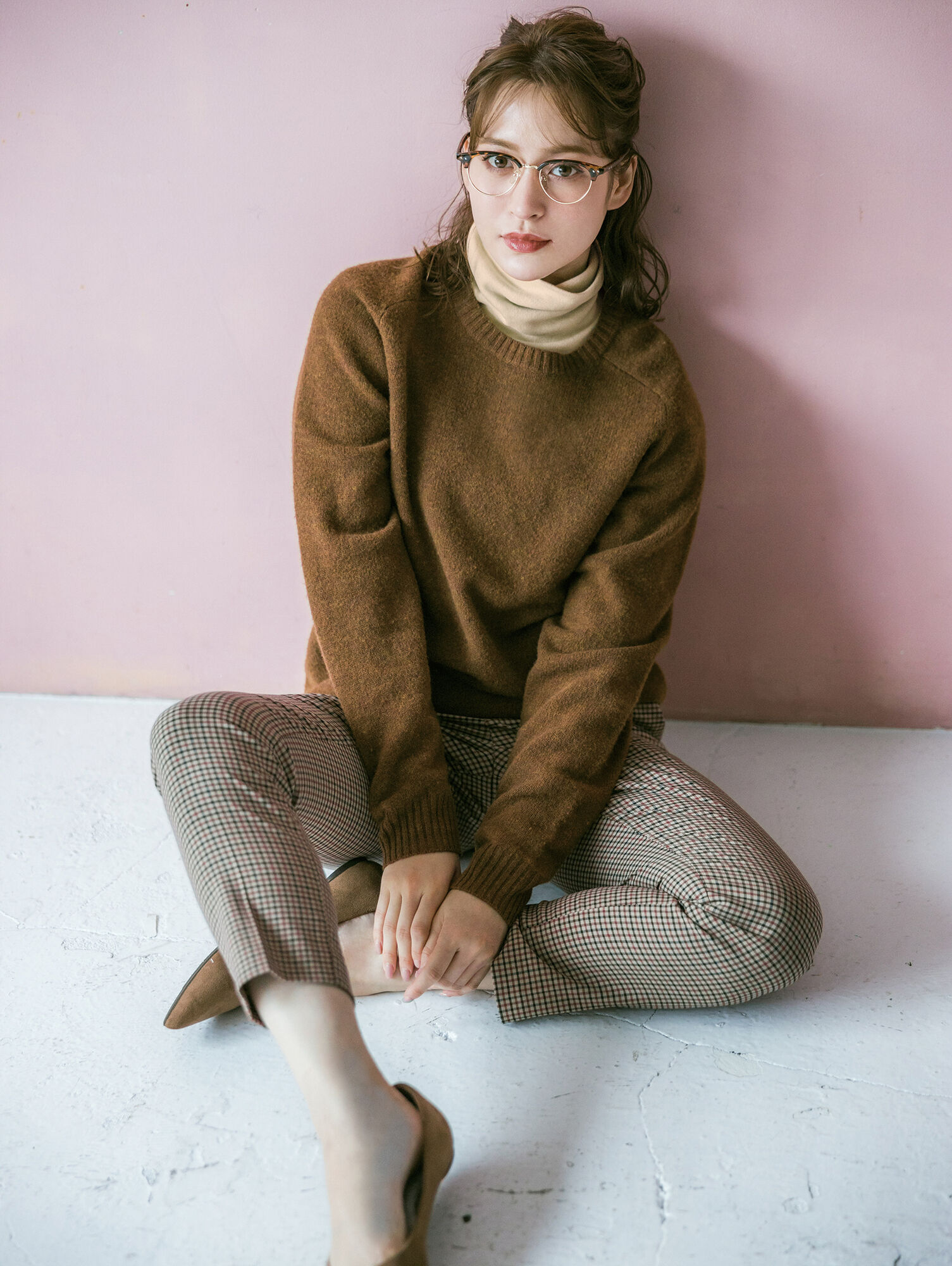 This monochrome arrangement sees the tops, pants, and shoes all coordinated in brown. Choose beige and its classy tone for the inner layer to create contrast with the sweater and brighten your visage. Then, mix in checked ankle-length pants and tortoise shell glasses to complete the sophisticated British look.