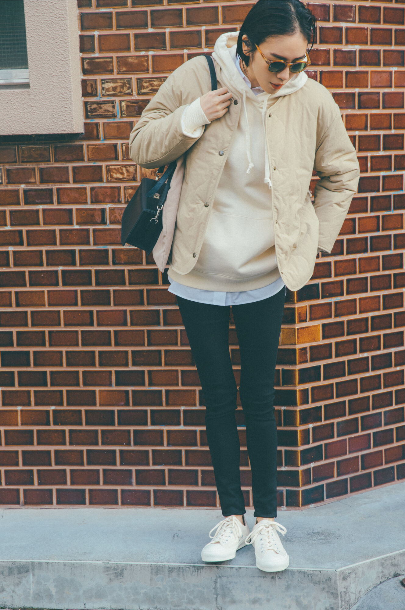 This oversized hooded sweatshirt confers both a stylish feel and a demure appearance, thanks to its relaxed cut, so it naturally lends itself to simple arrangements that bring out loose silhouettes. Try this casual black and white combination of a hoodie and black sneakers. In winter, wear the hoodie with a buttoned shirt or turtleneck sweater. In spring, let a tee peek out from under the neck opening and hem. Consider layering because it adds depth to arrangements and fosters a contemporary appearance.