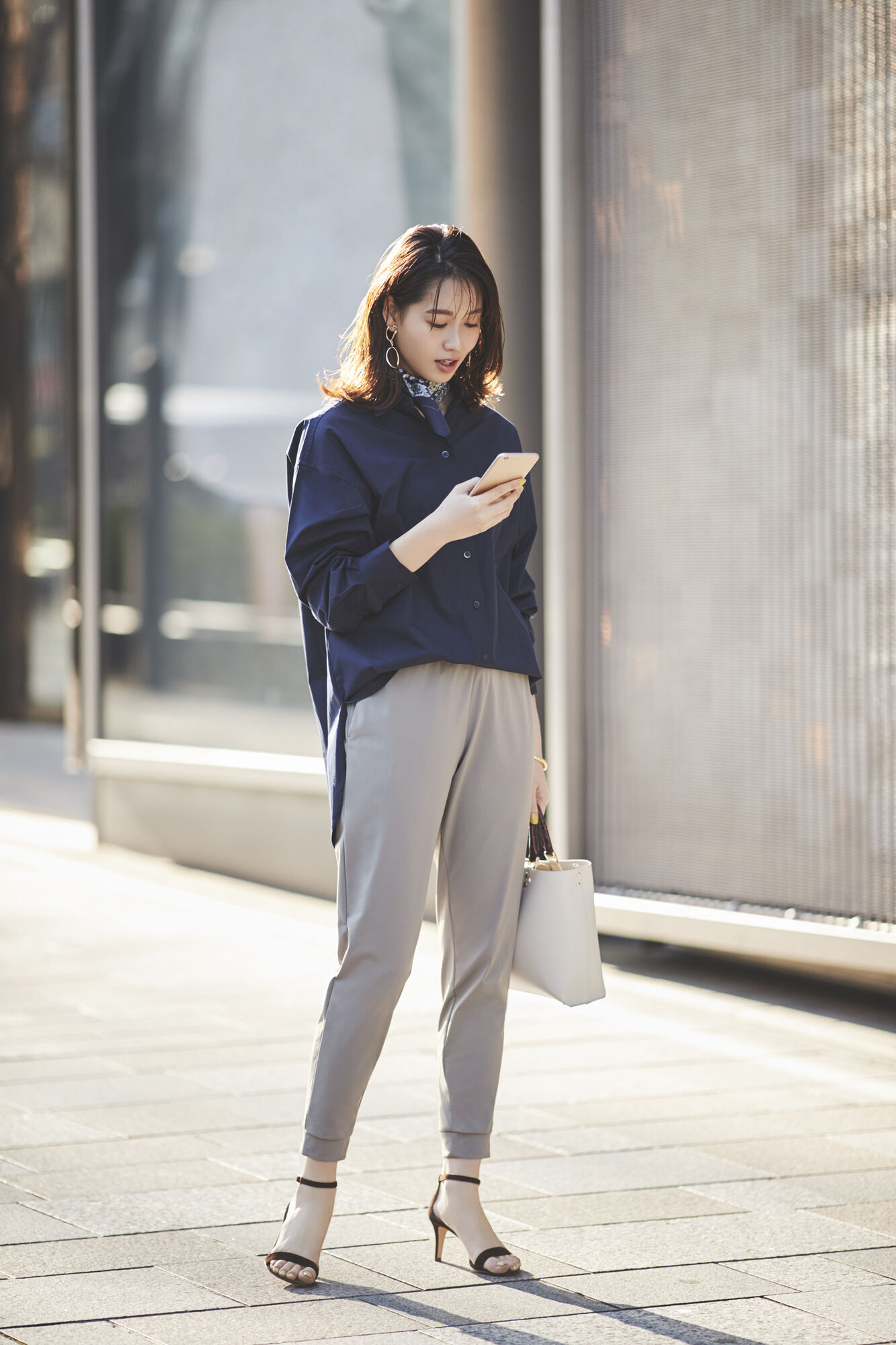 The joggers go great with clean-look items. Just like this combination of a button-up shirt and scarf, thanks to their matching color tones. They come in a variety of classy, sophisticated colors. For example, this pair’s beige tone isn’t too casual, so it looks sharp in clean-look arrangements. And the item’s ankle-length cut shows off the lower legs in a clean manner, so the joggers are ideal for the office as well. You’ll love how simply pairing them to a top that has a contemporary loose cut that shows a stylish contrast in the overall silhouette.
