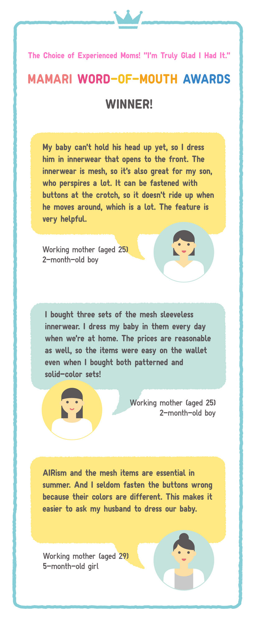 You might be wondering which innerwear to choose for babies, who naturally grow faster and perspire more. Because innerwear will come into direct contact with your baby’s delicate skin, you’ll want to be very particular about how gentle the innerwear is on skin and how comfortable it is. If you’re interested, we have some advice on innerwear and other items that you’ll want to prepare in advance of your baby’s arrival in summer. This includes suggestions on fabrics that are very breathable and are excellent at releasing moisture.