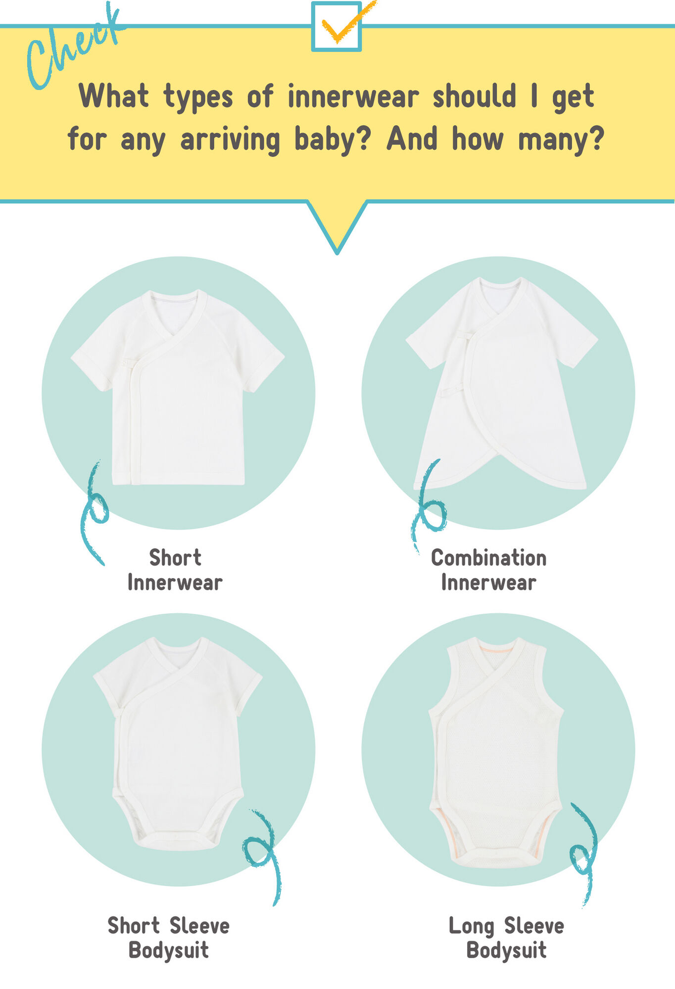 The short innerwear, which is for wicking perspiration, is worn directly over skin. The combination innerwear is for layering over top. And it’s for regulating body temperature. The short-sleeve and sleeveless bodysuits offer convenience. They can be used in place of the short innerwear. Plus, buttons at their crotches ensure tummies remain covered. You’ll want to prepare about five to six of each for wicking perspiration and regulating body temperature because perspiration and spit-ups necessitate two to three changes a day.