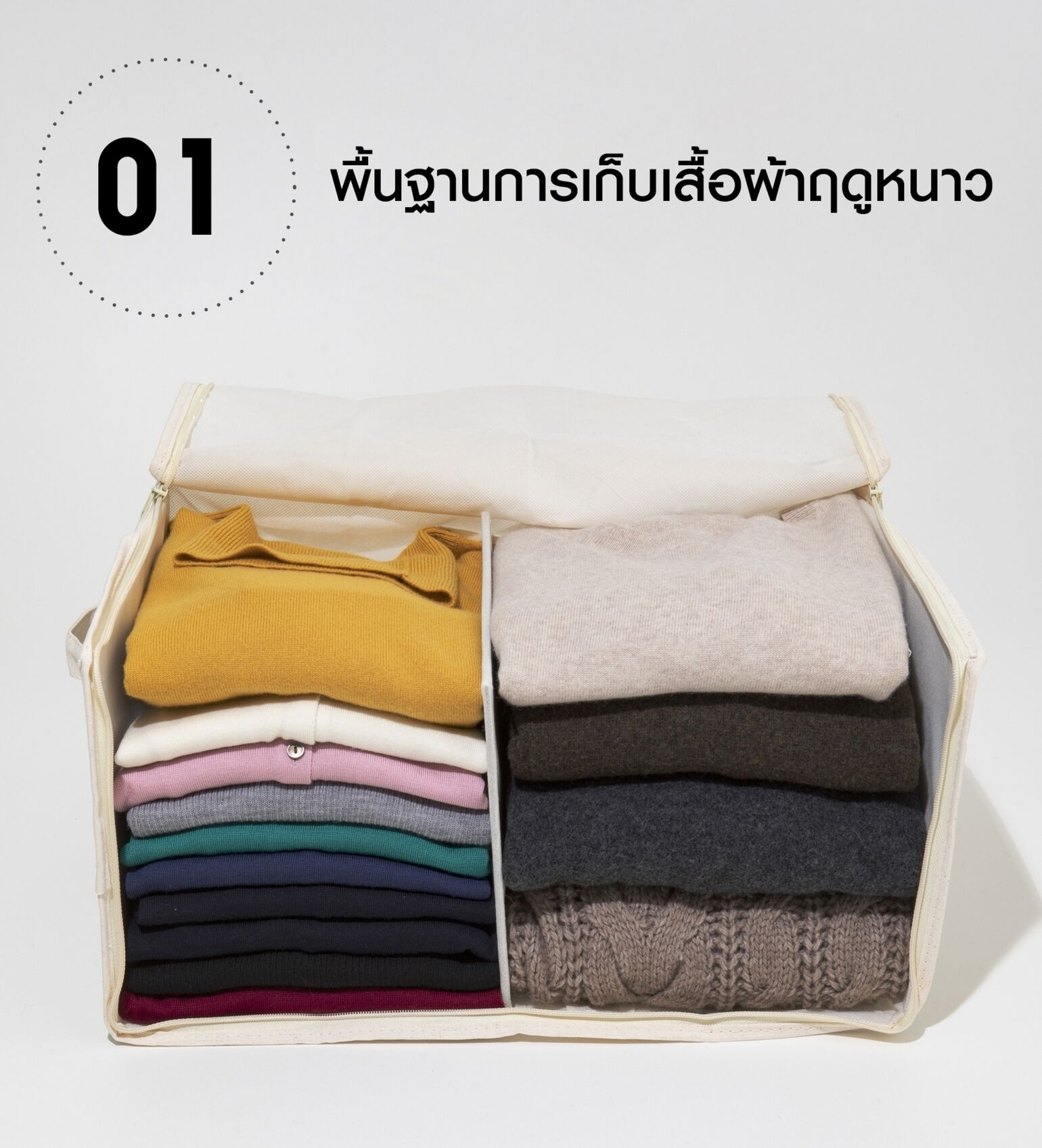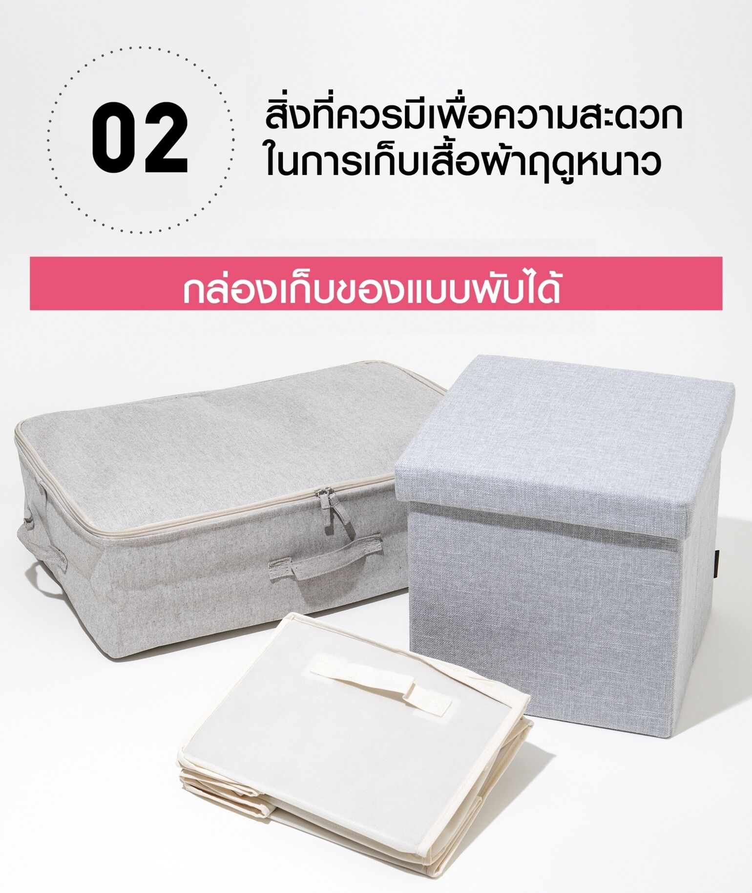 กล่องเก็บของแบบพับได้เป็นตัวเลือกที่น่าสนใจสำหรับการเก็บเสื้อผ้าฤดูหนาว เนื่องจากมีความสะดวกมากเป็นพิเศษ โดยกล่องขนาดใหญ่นั้นสามารถเก็บเสื้อสเวตเตอร์เนื้อหนาได้มากถึง 10 ตัว แต่ก็สามารถพับเก็บให้มีขนาดเล็กกะทัดรัดได้เมื่อไม่ได้ใช้งาน! ทั้งนี้กล่องเก็บของแบบพับได้มีรูปแบบและขนาดให้เลือกหลากหลาย ซึ่งทางที่ดีควรผสมผสานและจัดเรียงให้เหมาะสมกับตู้เสื้อผ้าที่ใช้ สำหรับสิ่งที่ควรเก็บไว้ในกล่องชนิดนี้ได้แก่สิ่งที่พับได้ เช่น เสื้อดาวน์ขนเป็ด เสื้อตัวนอกผ้าวูล และเสื้อถักไหมพรม เป็นต้น โดยให้วางกล่องที่เก็บของประเภทเดียวกันไว้ในชั้นด้านบนหรือส่วนบนของตู้เสื้อผ้า และเนื่องจากบริเวณพื้นตู้มีแนวโน้มที่จะเกิดการสะสมความชื้น อันเป็นการเพิ่มความเสี่ยงที่จะทำให้เสื้อผ้าที่เก็บไว้เกิดความเสียหาย จึงควรหลีกเลี่ยงการเก็บเสื้อผ้าไว้ในบริเวณดังกล่าว