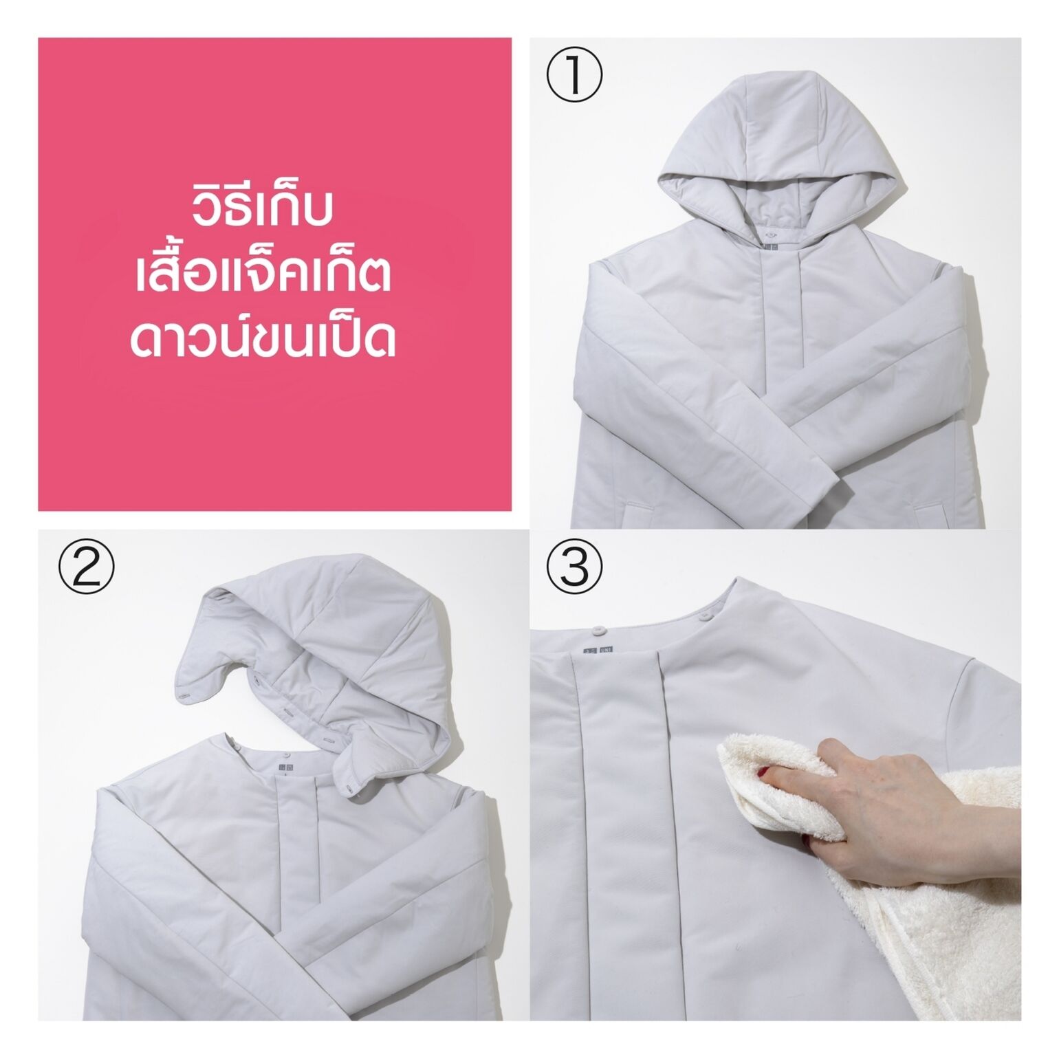 ขั้นตอนที่ 2: ถอดฮู้ดออก (ถ้าเป็นแบบถอดได้) แล้วนำไปเก็บด้วยกันกับตัวเสื้อ