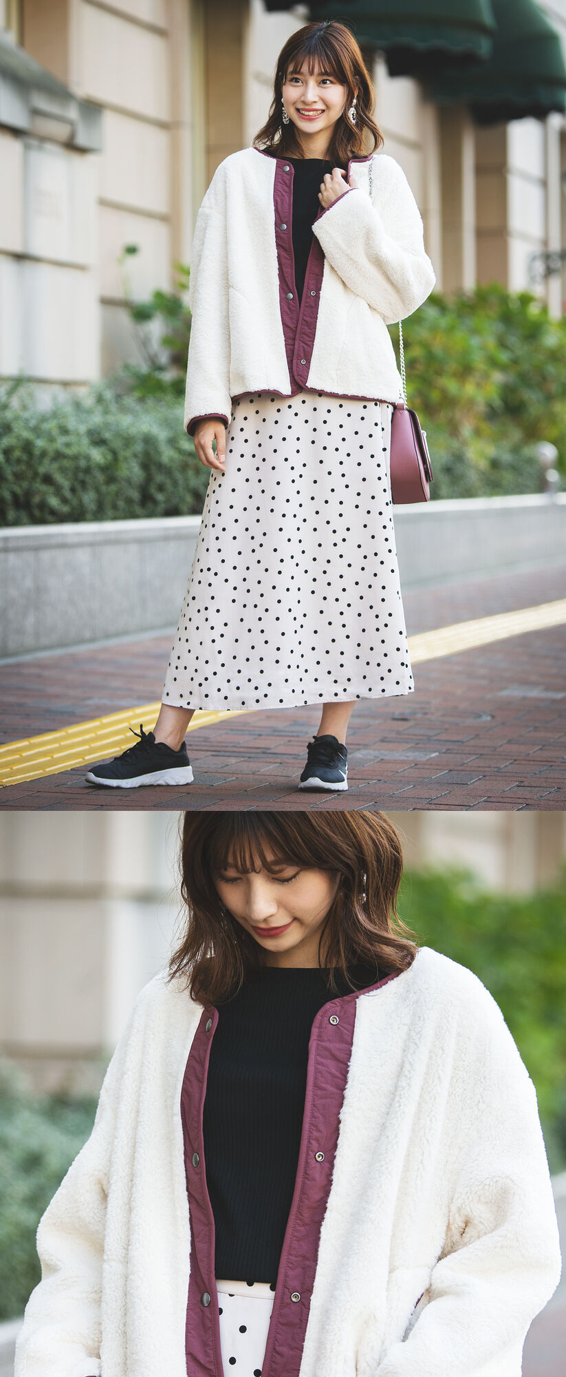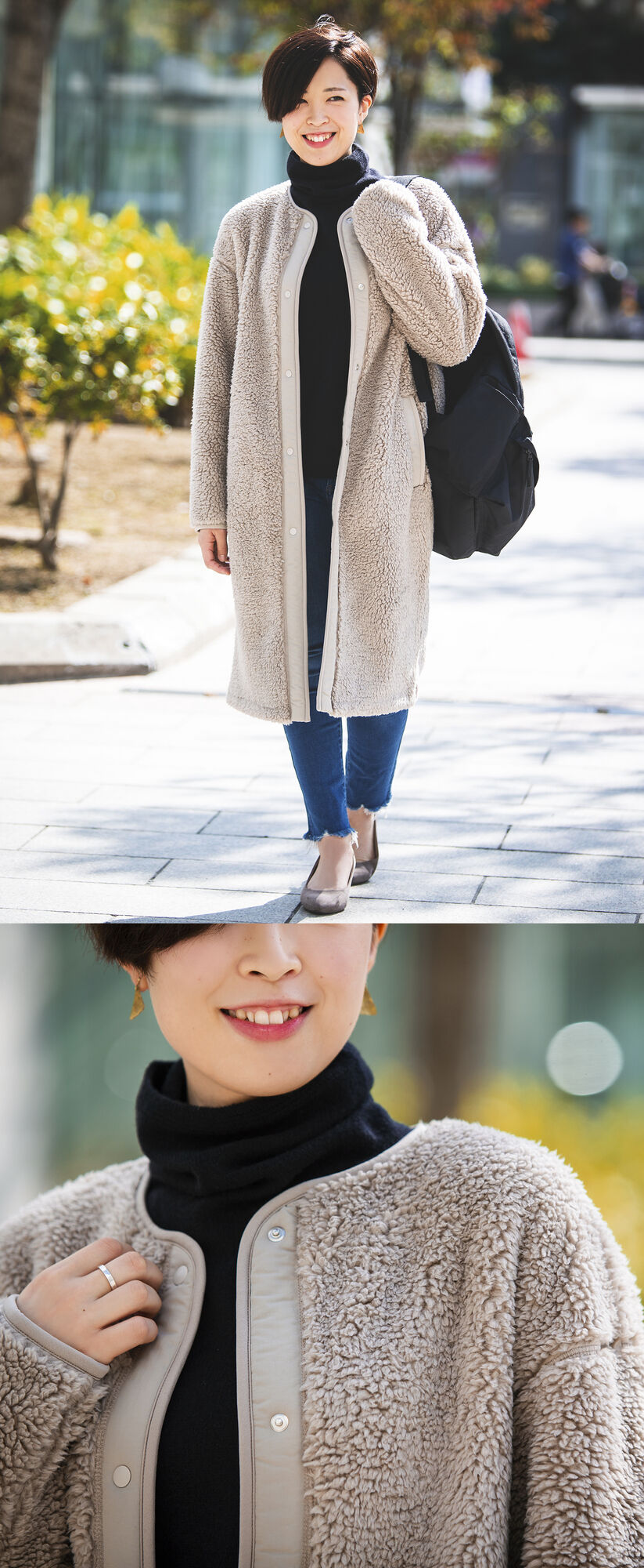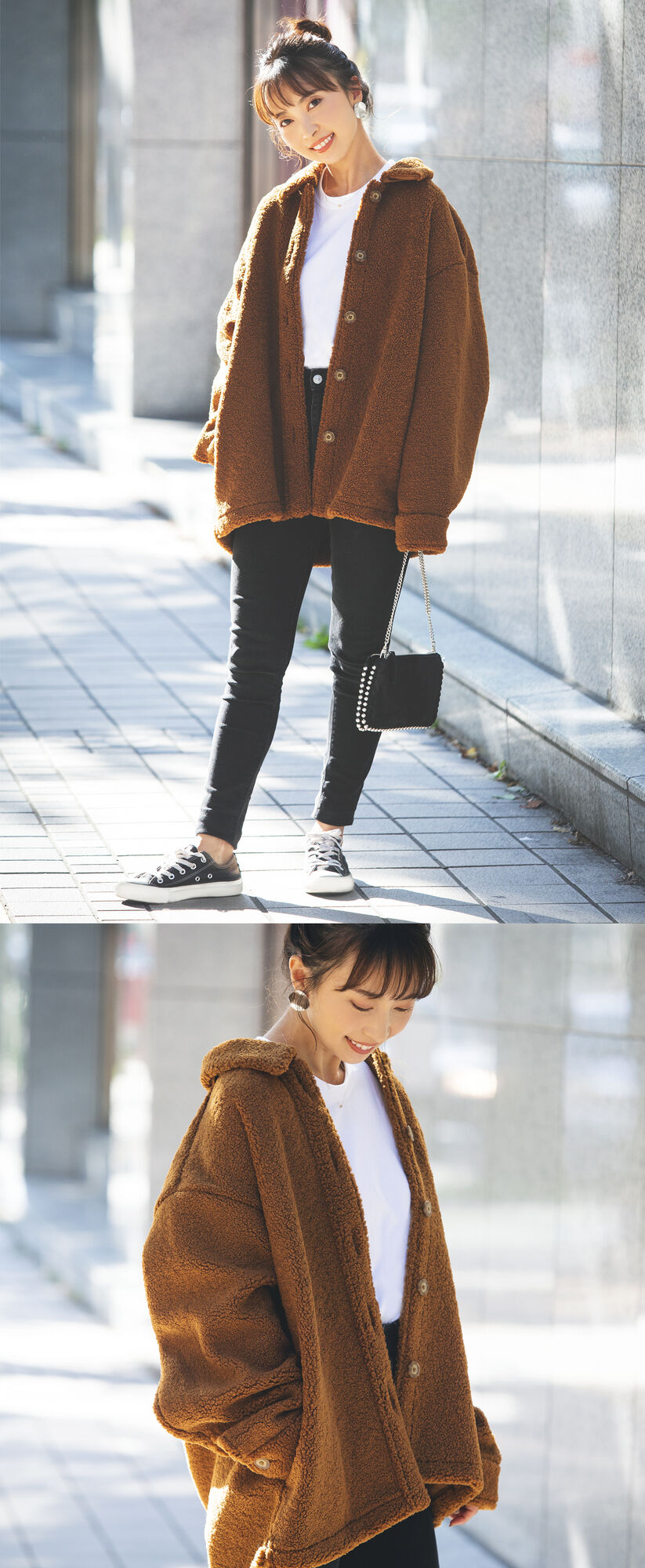 สาวสวยของเราคนนี้ใส่เสื้อโค้ทที่ด้านนอกเป็นผ้าฟลีซบุขนนุ่ม ส่วนด้านในเป็นผ้าไมโครฟลีซที่มีผิวสัมผัสที่ให้ความรู้สึกที่ยอดเยี่ยม โดยนอกจากจะมีรูปทรงกำลังดีแล้ว ยังใส่สบายและดูไม่หนาเทอะทะอีกด้วย! ส่วนท่อนล่างนั้นเป็นกางเกงผ้าเดนิมทรงสกินนี่ดีไซน์โฉบเฉี่ยว ปิดท้ายลุคให้ดูดีมีระดับด้วยรองเท้าส้นสูง