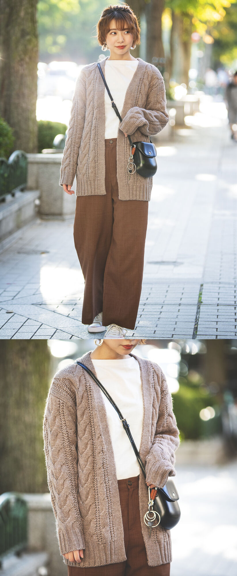 นำเสื้อคาร์ดิแกนผ้าถักสีเบจ เสื้อตัวในสีขาว และกางเกงขากว้างสีน้ำตาล มามิกซ์แอนด์แมทช์เป็นสไตล์โมโนโทนที่ดูนุ่มนวล โดยเป็นเสื้อคาร์ดิแกนถักลายโลว์เกจเนื้อหนาที่ดูน่ารักในดีไซน์ทรงยาวปิดสะโพกเข้ากับซีซั่น ซึ่งแมทช์กับทั้งกางเกงและกระโปรงได้อย่างมีสไตล์!