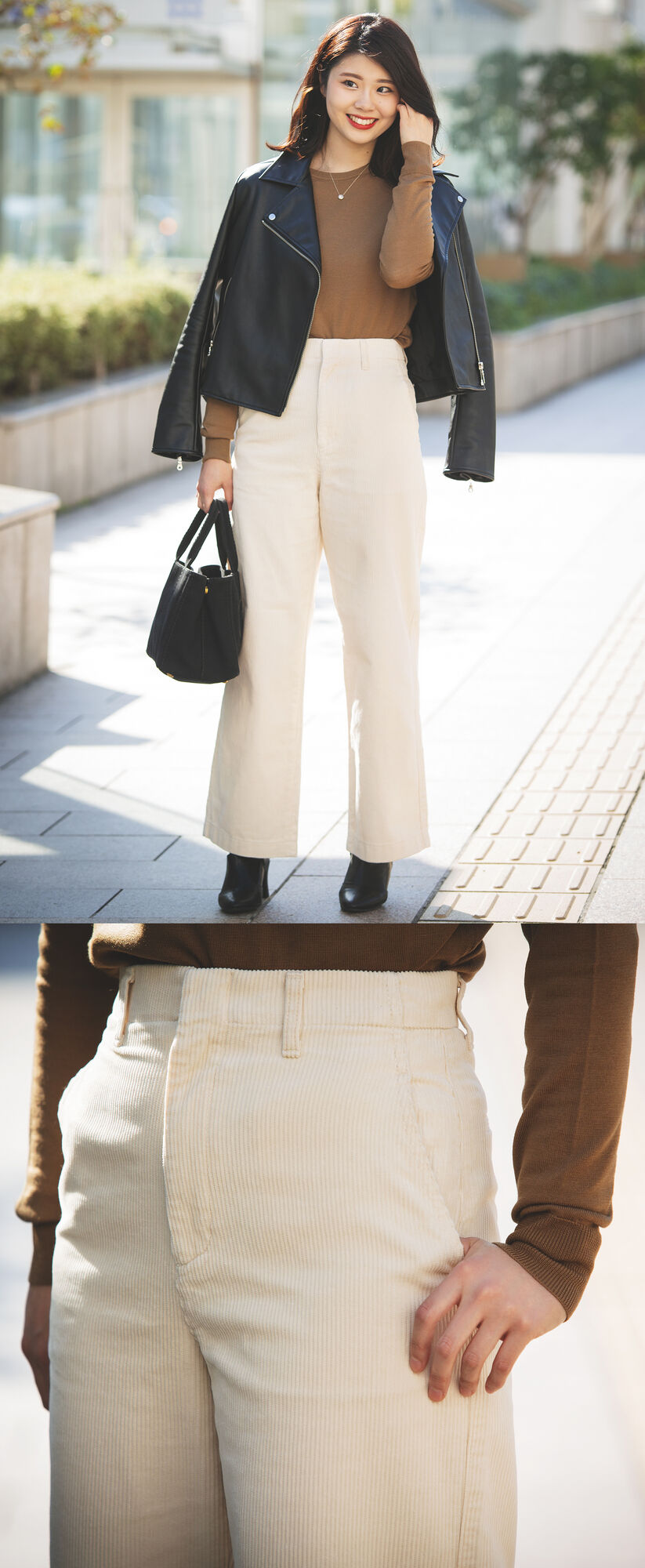 เติมสไตล์อินเทรนด์ให้กับกางเกงขากว้างดีไซน์เรียบง่ายได้ทันทีด้วยผ้าลูกฟูก! พร้อมทรงเอวสูงที่เสริมให้ช่วงขาดูเรียวยาวยิ่งขึ้นเมื่อเก็บชายเสื้อไว้ในกางเกง และแม้จะสวมทับด้วยเสื้อแจ็คเก็ตไรเดอร์ที่ดูทะมัดทะแมง แต่ด้วยการผสานดีไซน์ระหว่างเนื้อสัมผัสที่ดูอบอุ่นกับสีขาวสะอาดตาของผ้าลูกฟูก ทำให้ยังคงภาพลักษณ์ที่อ่อนโยนเอาไว้ได้
